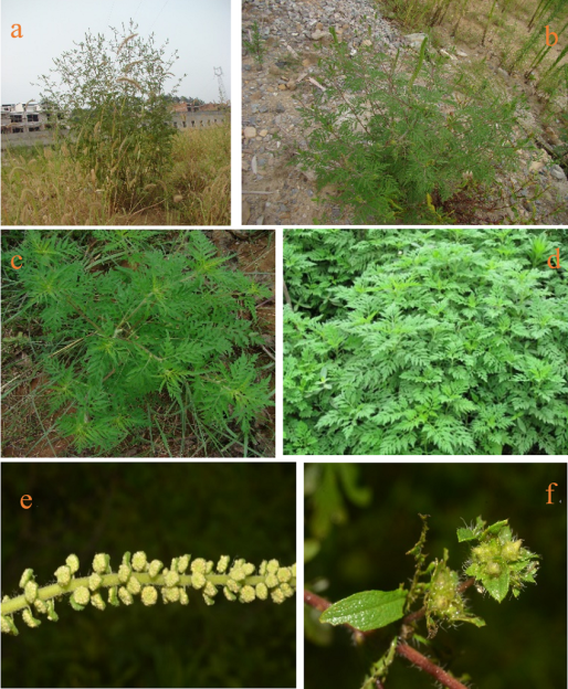 (一)生物特征。一年生草本,高20~150cm。茎直立,上部有圆锥状分枝,有棱,被疏生密糙毛。下部叶对生,具短叶柄,一至二回羽状深裂,裂片狭小,长圆形至倒披针形,全缘,有明显的中脉,上面深绿色,被细短伏毛或近无毛,背面灰绿色,被密短糙毛;上部叶互生,无柄,羽状分裂。雄头状花序半球形或卵形,径4~5mm,具短梗,下垂,在枝端密集成总状花序;总苞宽半球形或碟形,总苞片全部结合,无肋,边缘具波状圆齿,稍被糙伏毛;花托具刚毛状托片;每个头状花序有 10~ 16朵管状花,花冠淡黄色,长约2mm,有短管部,上部钟状,有宽裂片;花药卵圆形;雌头状花序无花序梗,在雄头花序下面或在下部叶腋单生,或2~3个密集成团伞状,有1个无被可育的雌花,被闭合总苞包裹,总苞片结合,倒卵形或卵状长圆形,长4~5毫米,宽约2毫米,顶端有围裹花柱的圆锥状嘴部,稍被糙毛,花柱2深裂,丝状。瘦果倒卵形,无毛,藏于坚硬的总苞中形成带刺的瘦果,倒卵形或卵状长圆形,长4~5mm,宽约2mm,顶端为总苞顶端形成的圆锥状喙部,在顶部以下有4~6个尖刺。花期8—9月,果期9—10月。