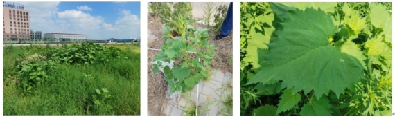 假苍耳主要生物学特征(左,生境;中,幼苗;右,叶片)