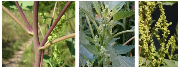 假苍耳的主要生物学特征(左,茎;中,花;右,果)