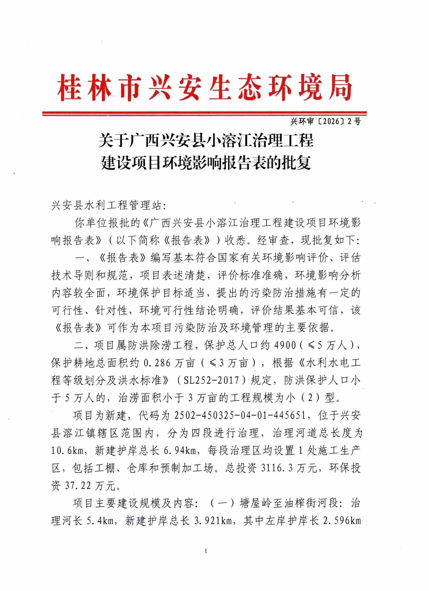 关于广西兴安县小溶江治理工程建设项目环境影响报告表的批复兴环审〔2026〕2号