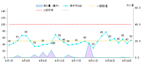 2024年9月桂林市城市环境空气质量指数(AQI指数)范围29~77,优良天数30天,其中优19天,良11天,空气质量优良天数比例为100%。2024年1-9月,桂林市空气质量优良天数比例为98.2%,与上年同期相比,上升1.9个百分点。