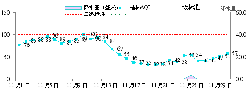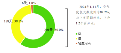 2024年11月桂林市城市环境空气质量指数(AQI指数)范围32~100,优良天数30天,其中优11天,良19天,空气质量优良天数比例为100%。2024年1-11月,桂林市空气质量优良天数比例为98.2%,与上年同期相比,上升1.2个百分点。