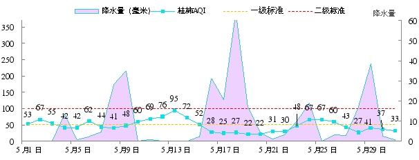 2025年5月桂林市城市环境空气质量指数(AQI指数)范围为22~95,空气质量优的天数为18天,良13天,空气质量优良天数比例为100%,与去年同期一致。2025年1—5月,桂林市空气质量优良天数比例为88.1%,同比下降8.6个百分点。