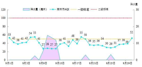 2025年9月桂林市空气质量指数(AQI)范围为27~55,空气质量为优25天,良5天,空气质量优良天数比例为100%,同比持平。2025年1—9月,桂林市空气质量优良天数比例为93.4%,同比下降4.8个百分点。