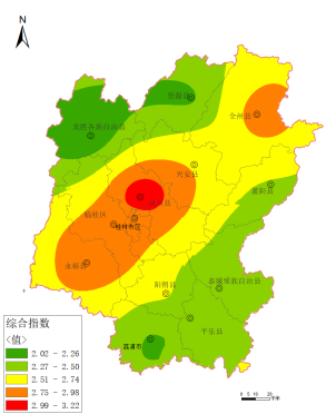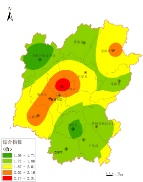 2025年1—9月,桂林市各辖县(区、市)空气质量优良天数比例为93.4%~99.6%,PM2.5 平均浓度为 19~31微克/立方米,综合指数为 2.02~3.23,空气质量由好到差排名分别为:龙胜县、资源县、荔浦市、恭城县、平乐县、灌阳县、阳朔县、兴安县、全州县、临桂区、永福县、灵川县。环境空气质量综合指数分布详见图3、图 4。