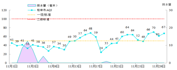 2025年11月,桂林市空气质量指数(AQI)范围为24~70,空气质量为优18天,良12天,空气质量优良天数比例为100%,与上年同期相比持平。2025年1—11月,桂林市空气质量优良天数比例为94.6%,同比下降3.6个百分点。