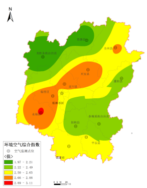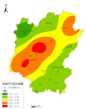 2025年1—11月,桂林市各辖县(区、市)空气质量优良天数比例为94.6%~99.7%,PM2.5 平均浓度为 19~30微克/立方米,综合指数为 2.01~3.20,空气质量由好到差排名分别为:龙胜县、资源县、恭城县、荔浦市、平乐县、灌阳县、阳朔县、兴安县、全州县、临桂区、永福县、灵川县。环境空气质量综合指数分布详见图3、图 4。