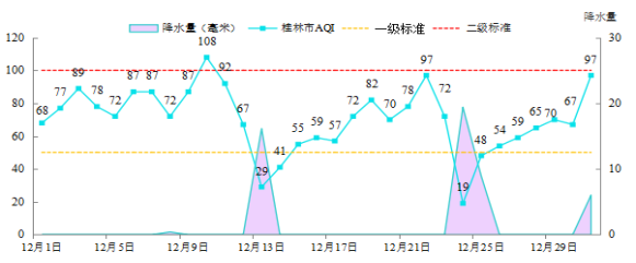 2025年12月桂林市空气质量指数(AQI)范围为19~108,空气质量为优4天,良26天,轻度污染1天,空气质量优良天数比例为96.8%,同比上升16.2个百分点。2025年1—12月,桂林市空气质量优良天数比例为94.8%,同比下降1.9个百分点。