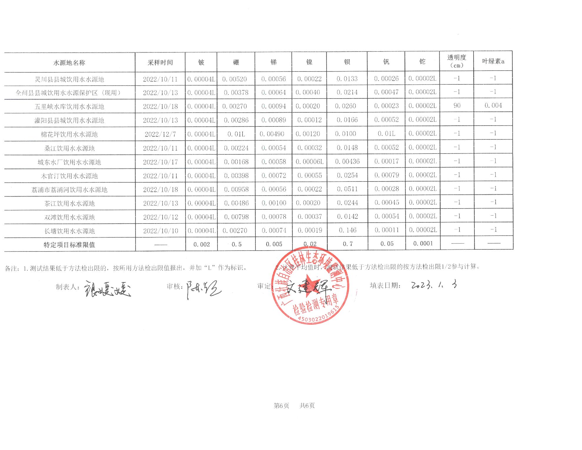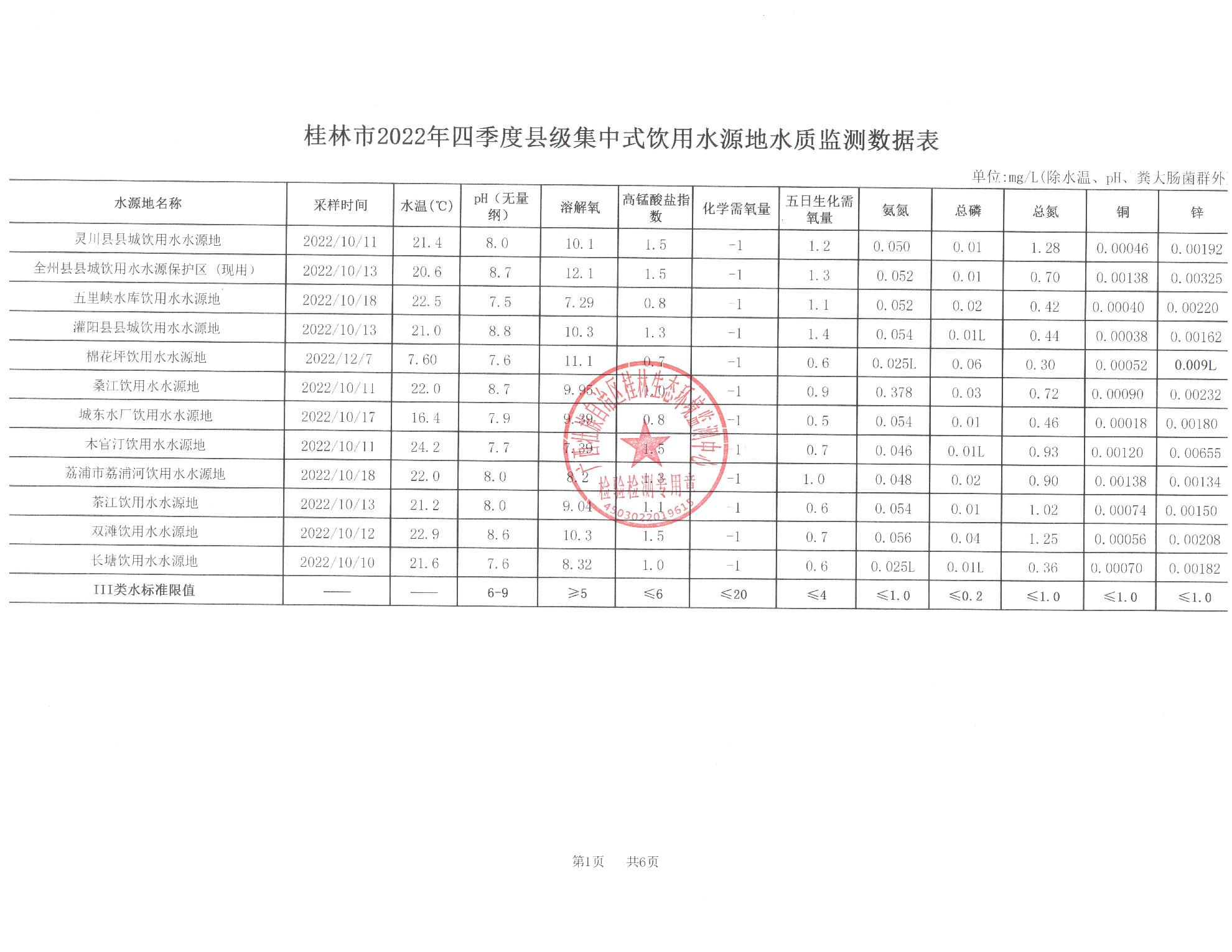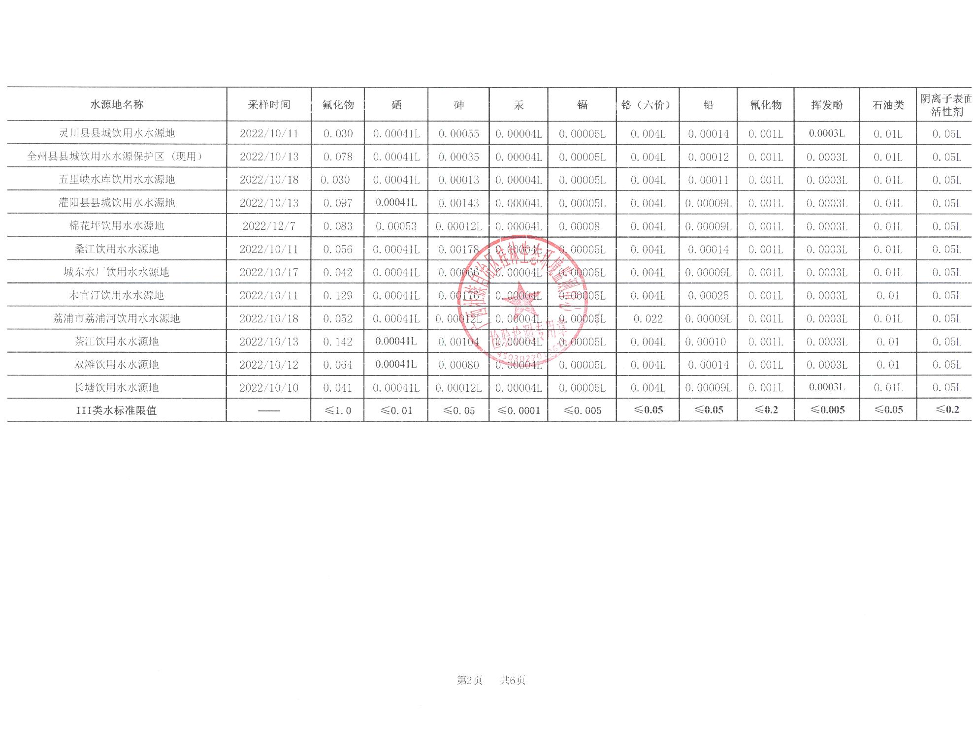 2022年第四季度五里峡饮用水报告表