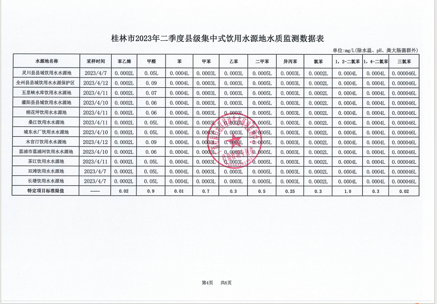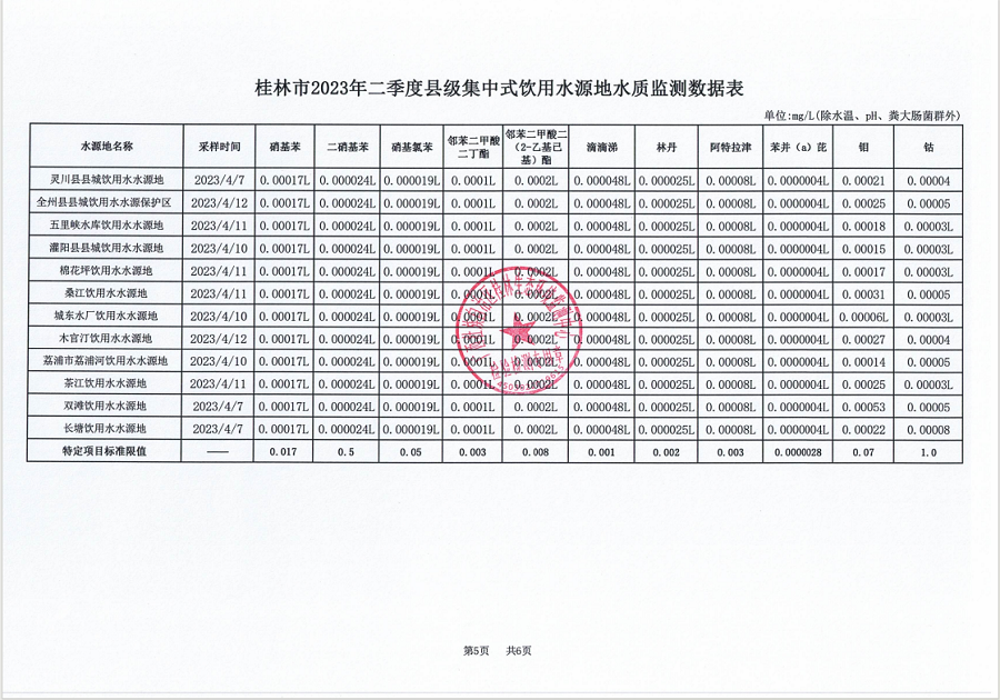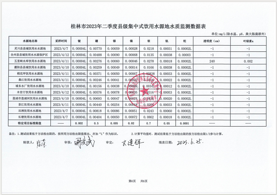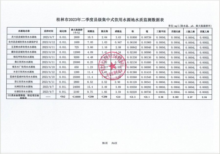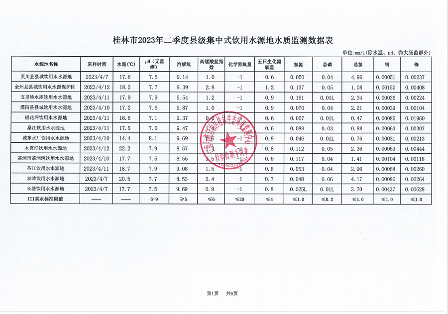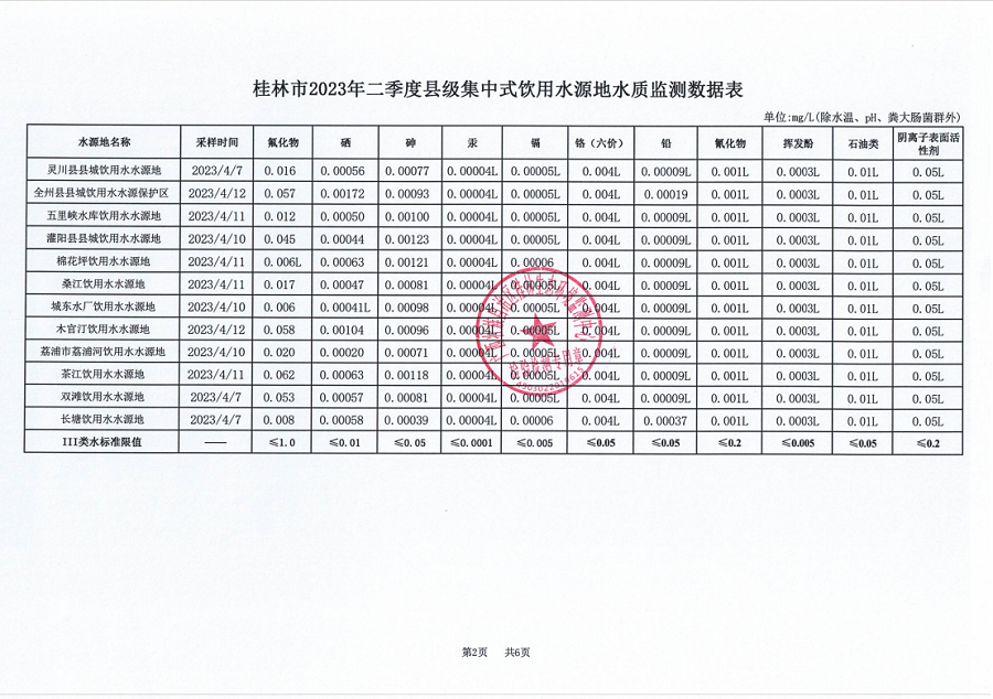 桂林市2023年二季度县级集中式饮用水源地水质监测数据表