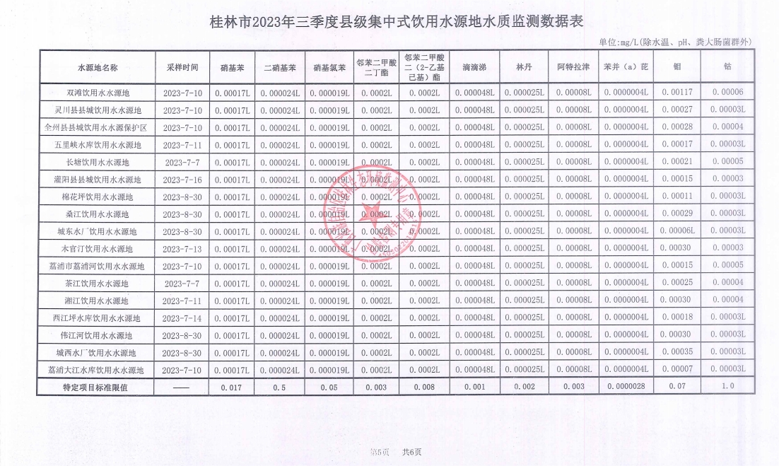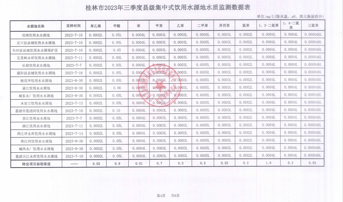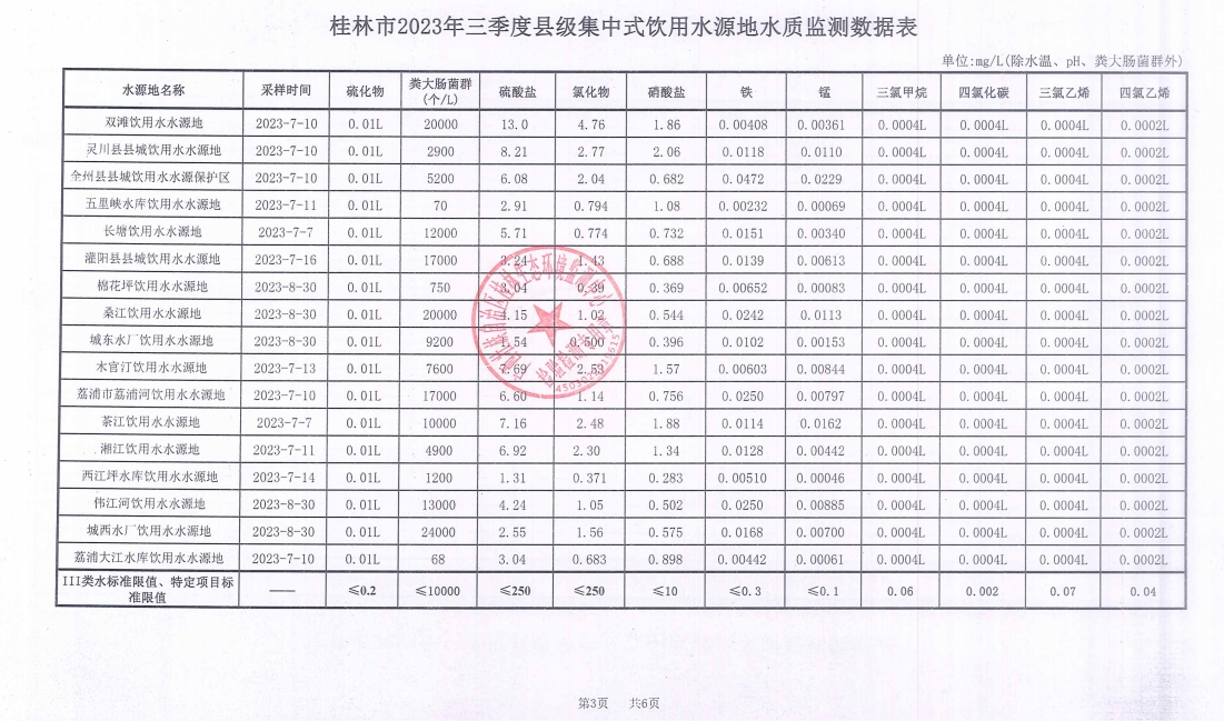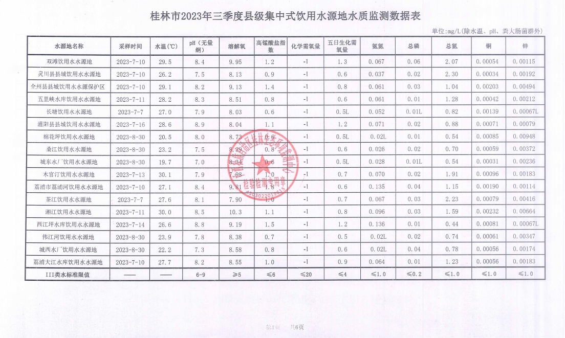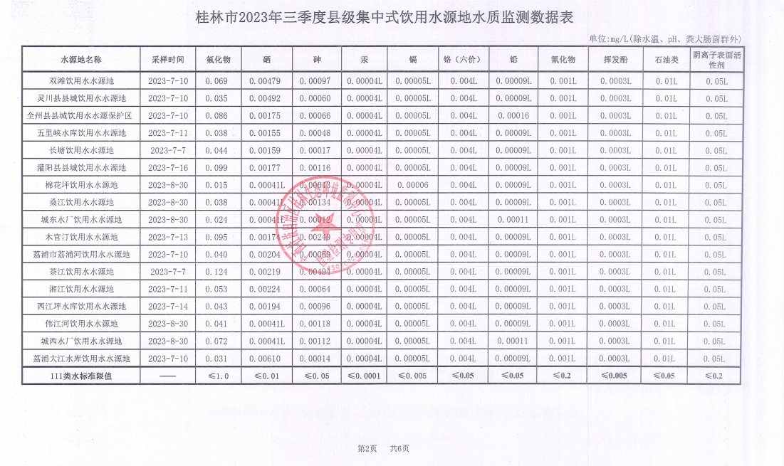桂林市2023年三季度县级集中式饮用水源地水质监测数据表