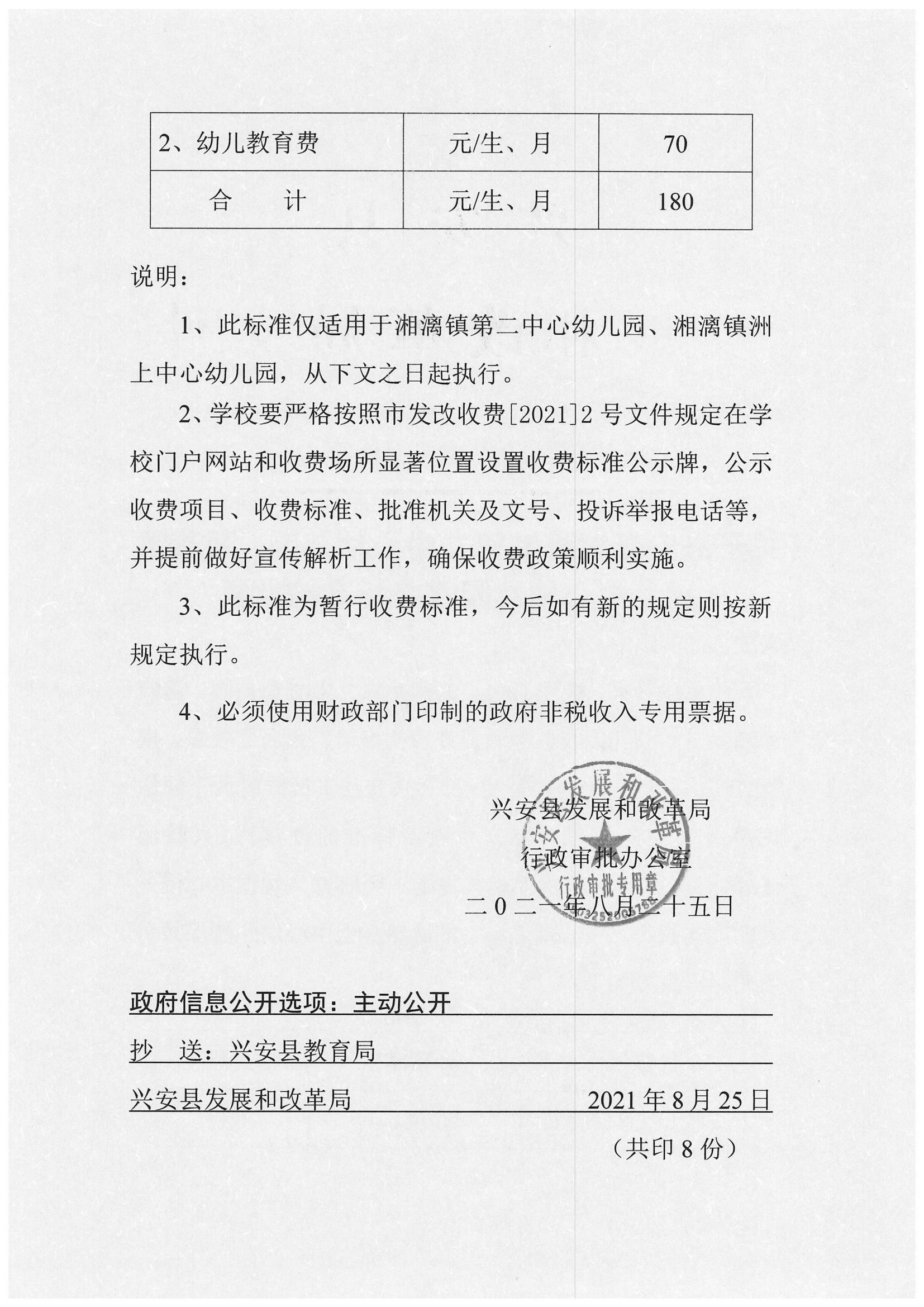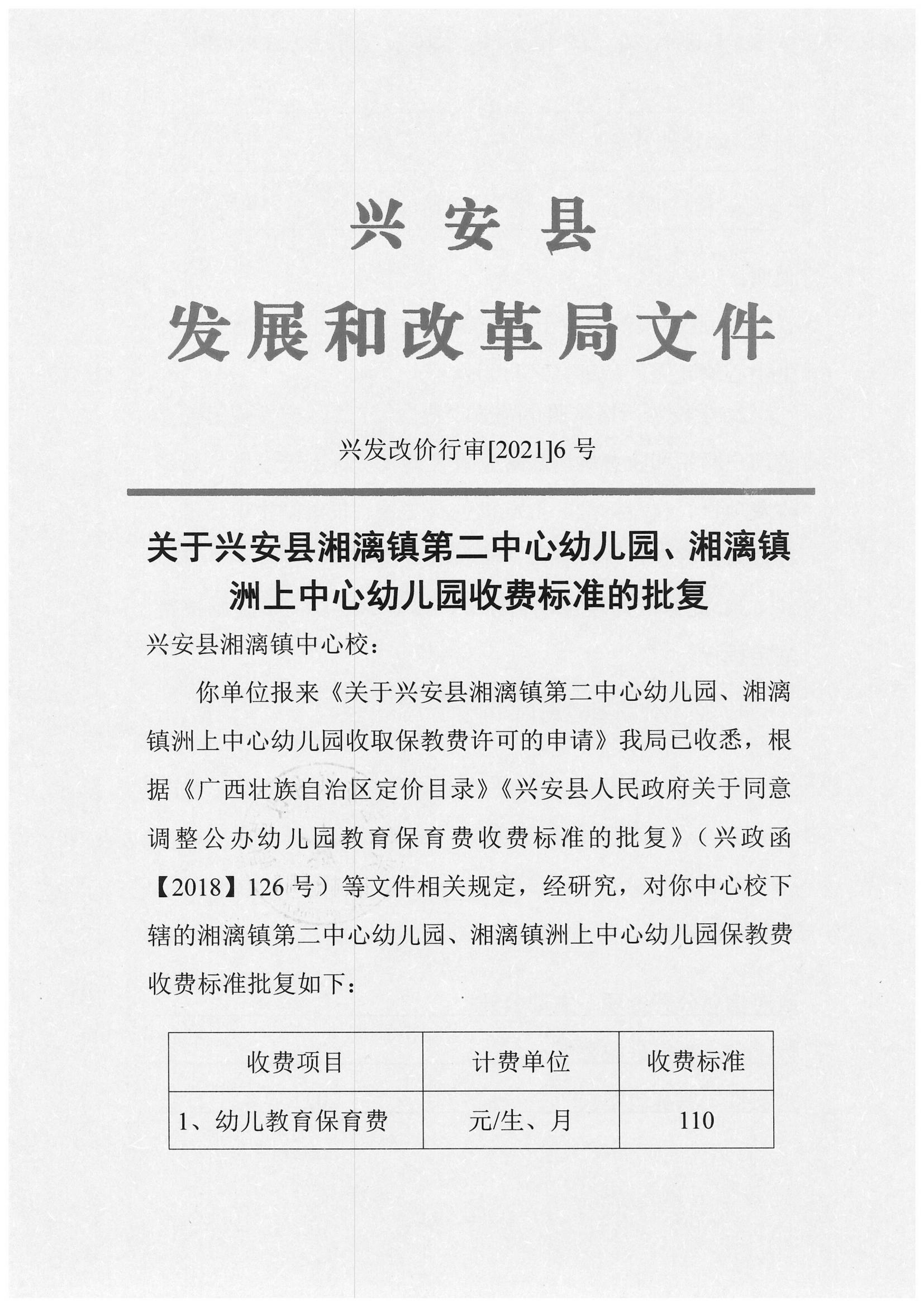 兴安县发展和改革局关于兴安县湘漓镇第二中心幼儿园、湘漓镇洲上中心幼儿园收费标准的批复