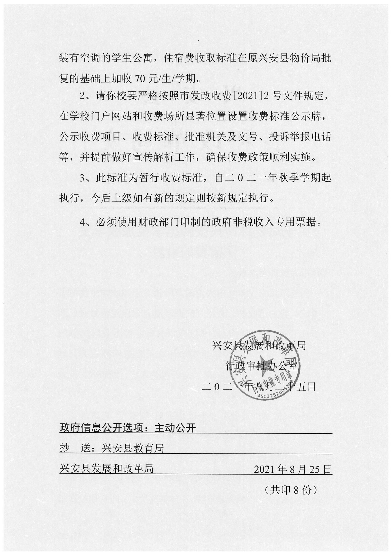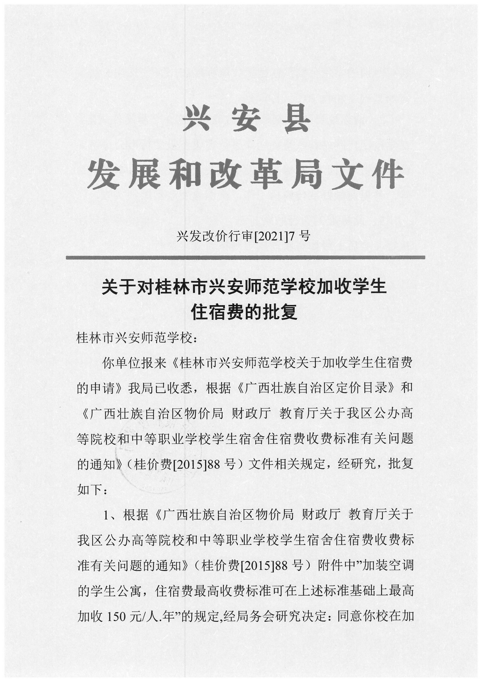 兴安县发展和改革局关于对桂林市兴安师范学校加收学生住宿费的批复
