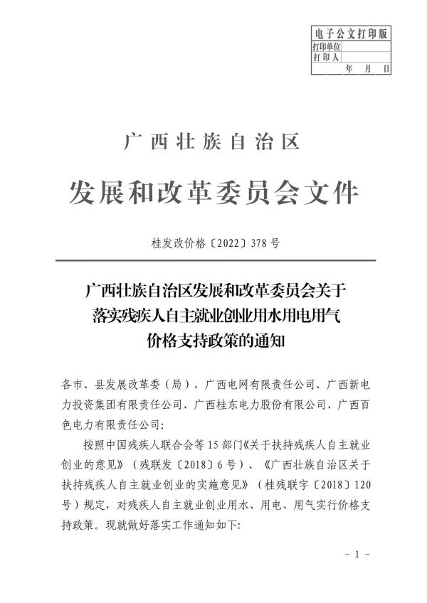 广西壮族自治区发展和改革委员会关于落实残疾人自主就业创业用水用电用气价格支持政策的通知