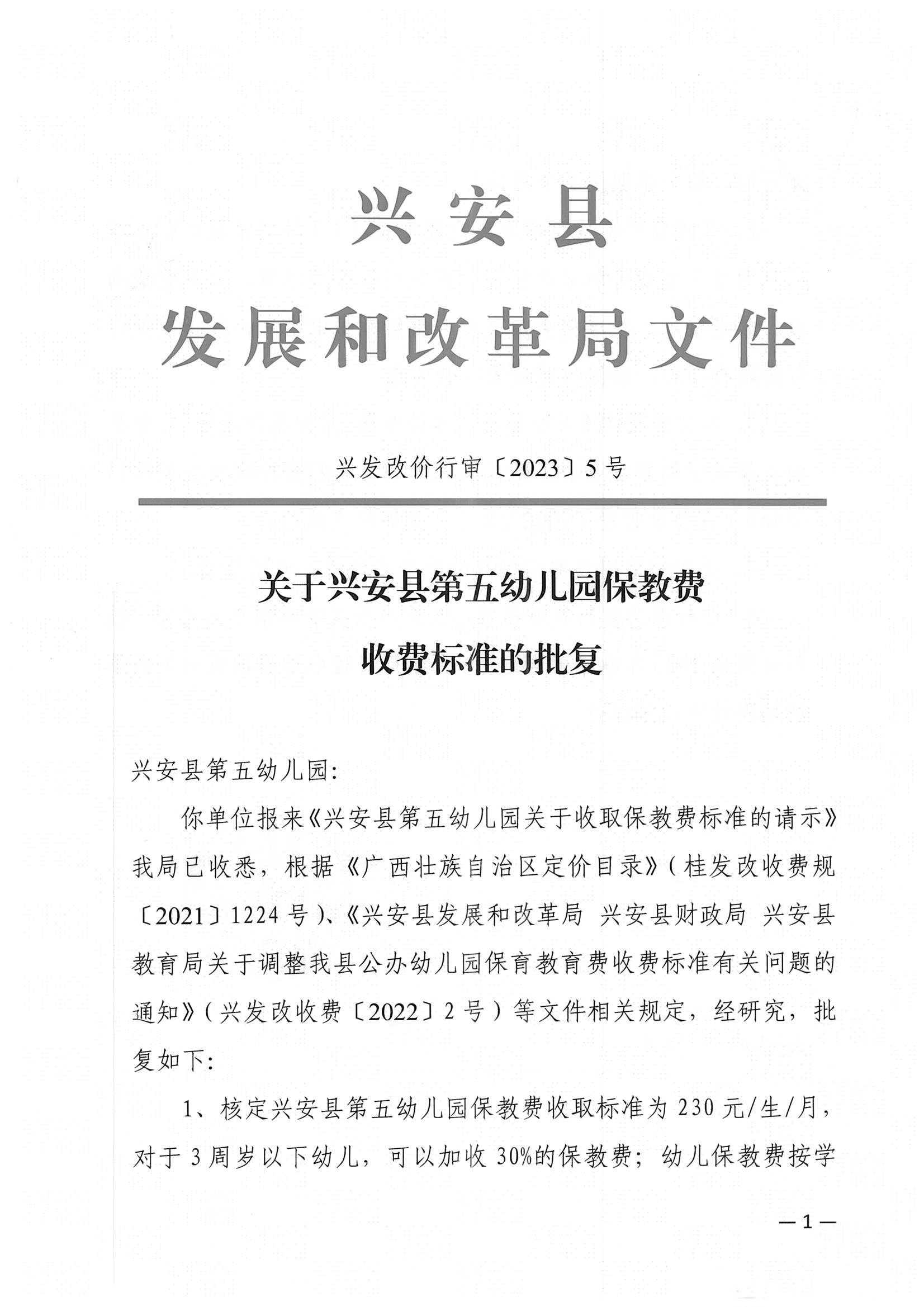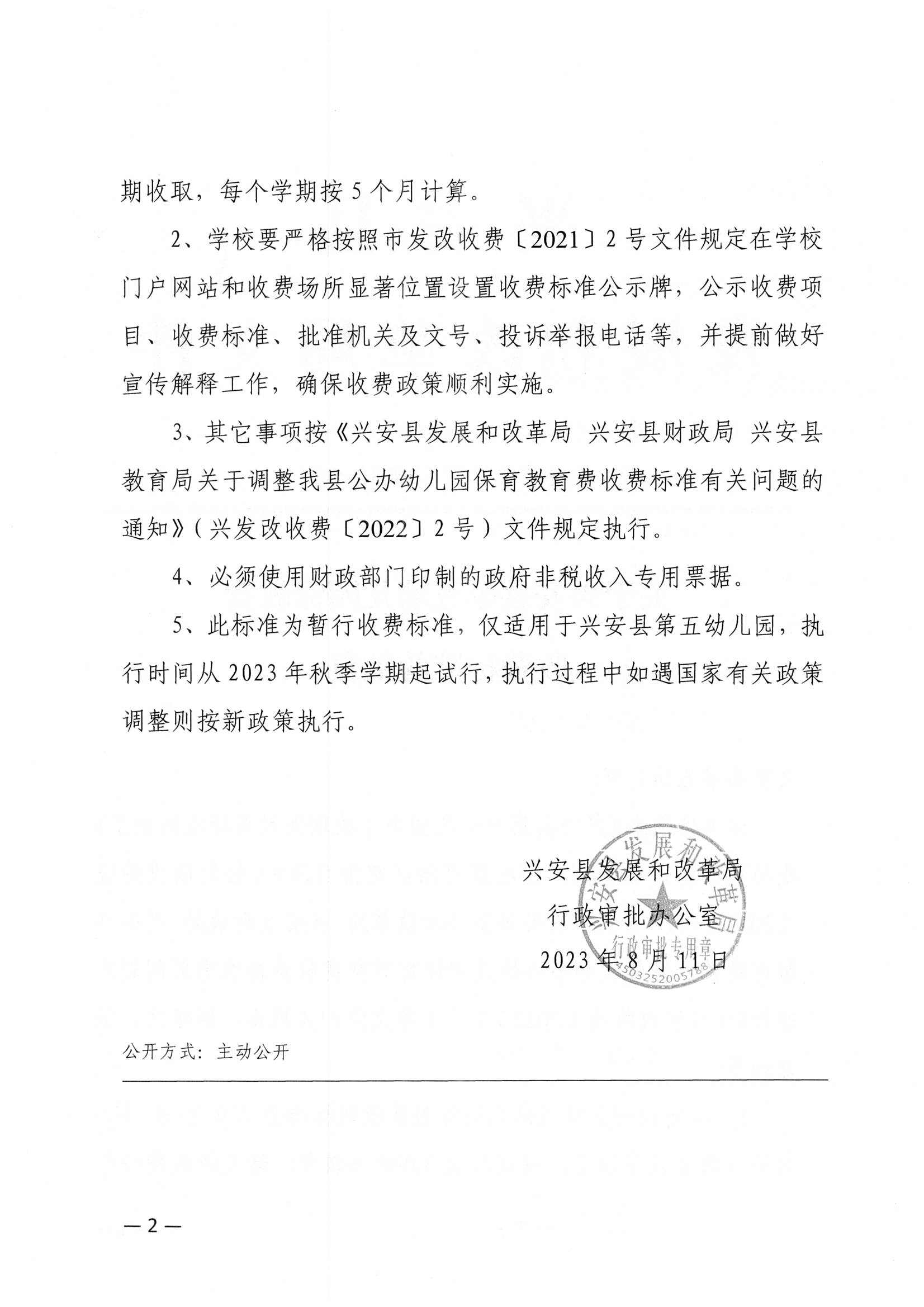 兴发改价行审〔2023〕5号 关于兴安县第五幼儿园收费标准的批复
