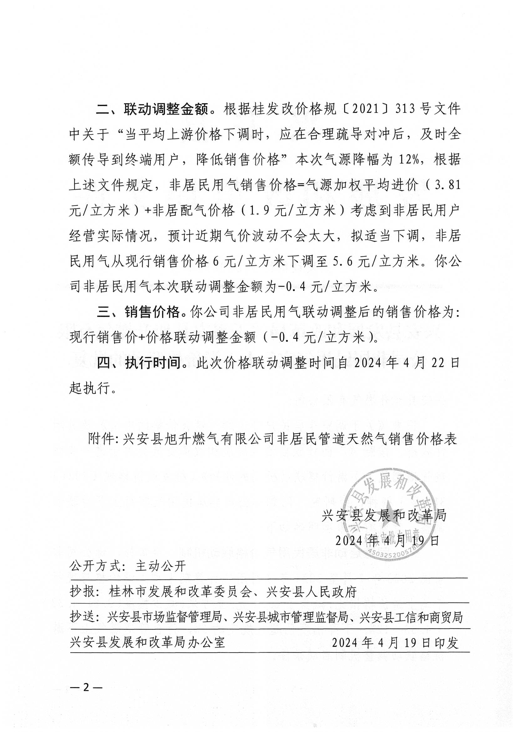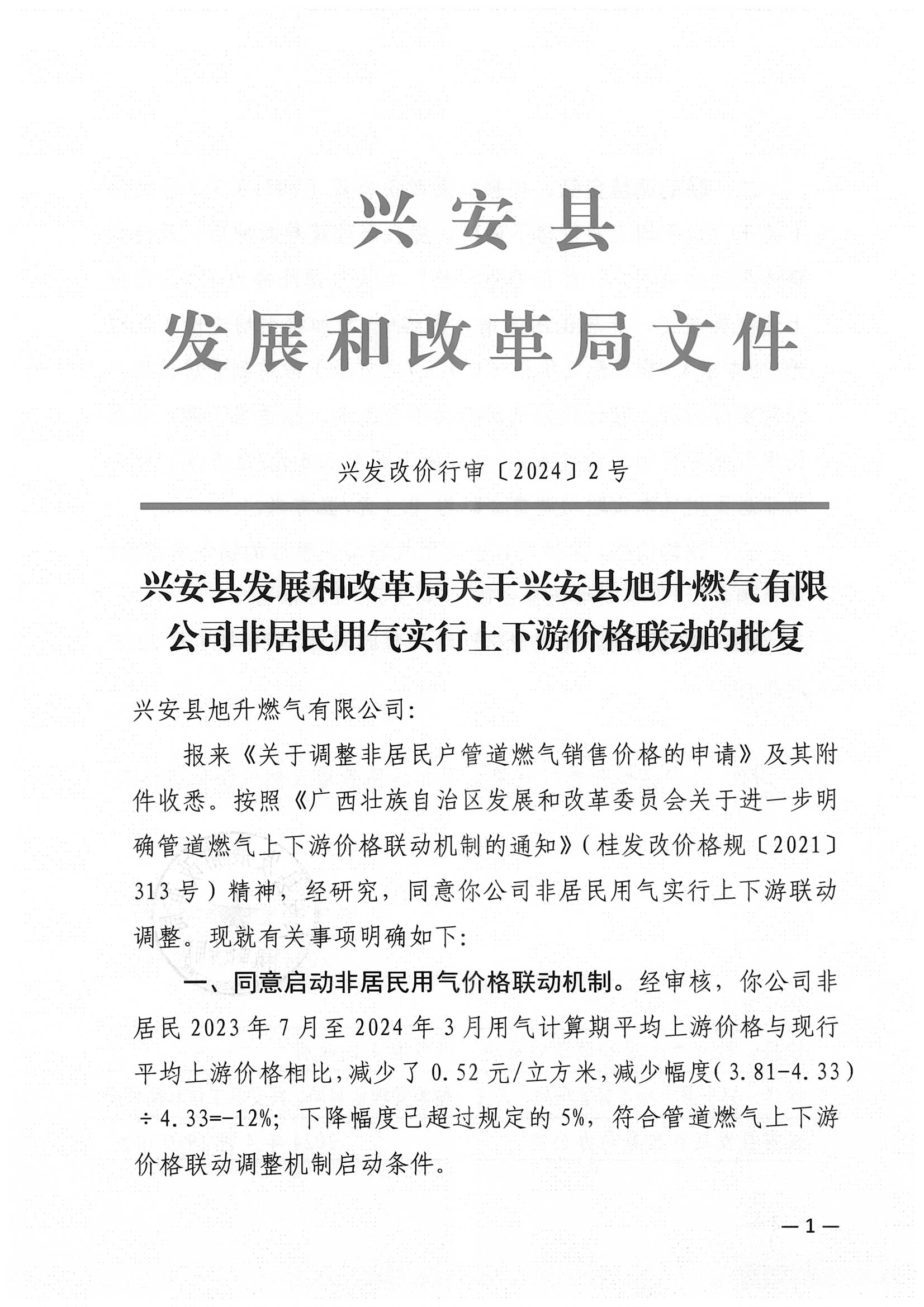 兴发改价行审〔2024〕2号关于联动调整兴安县旭升燃气有限公司非居民天然气销售价格的批复