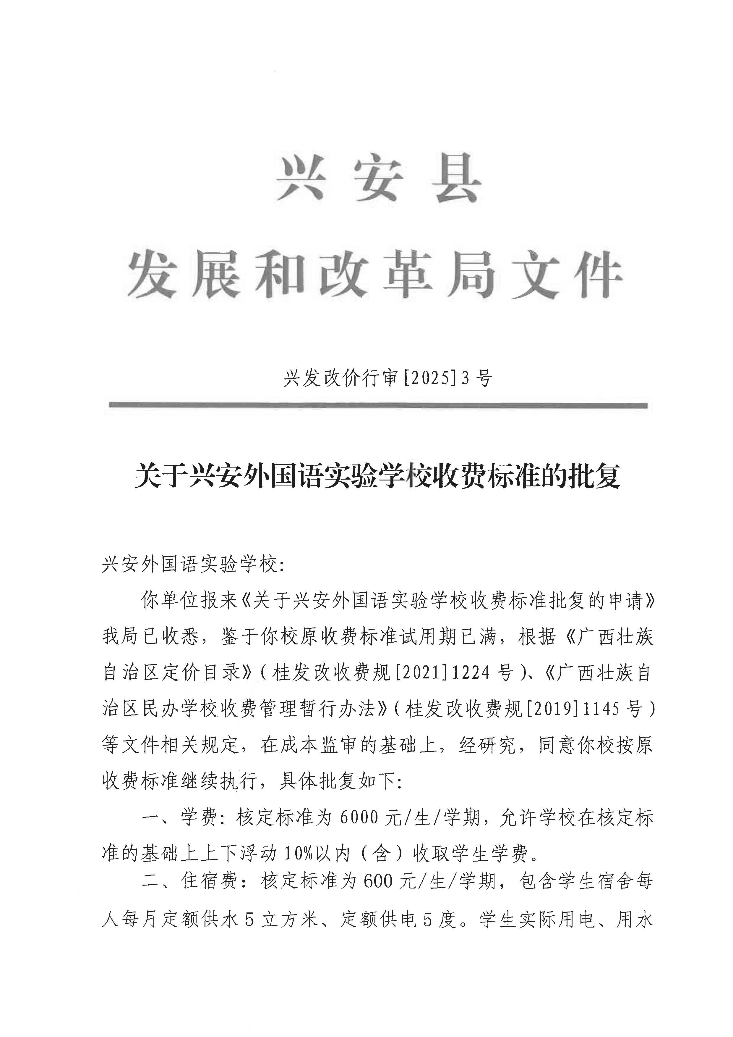 兴发改价行审〔2025〕3号 关于兴安外国语实验学校收费标准的批复