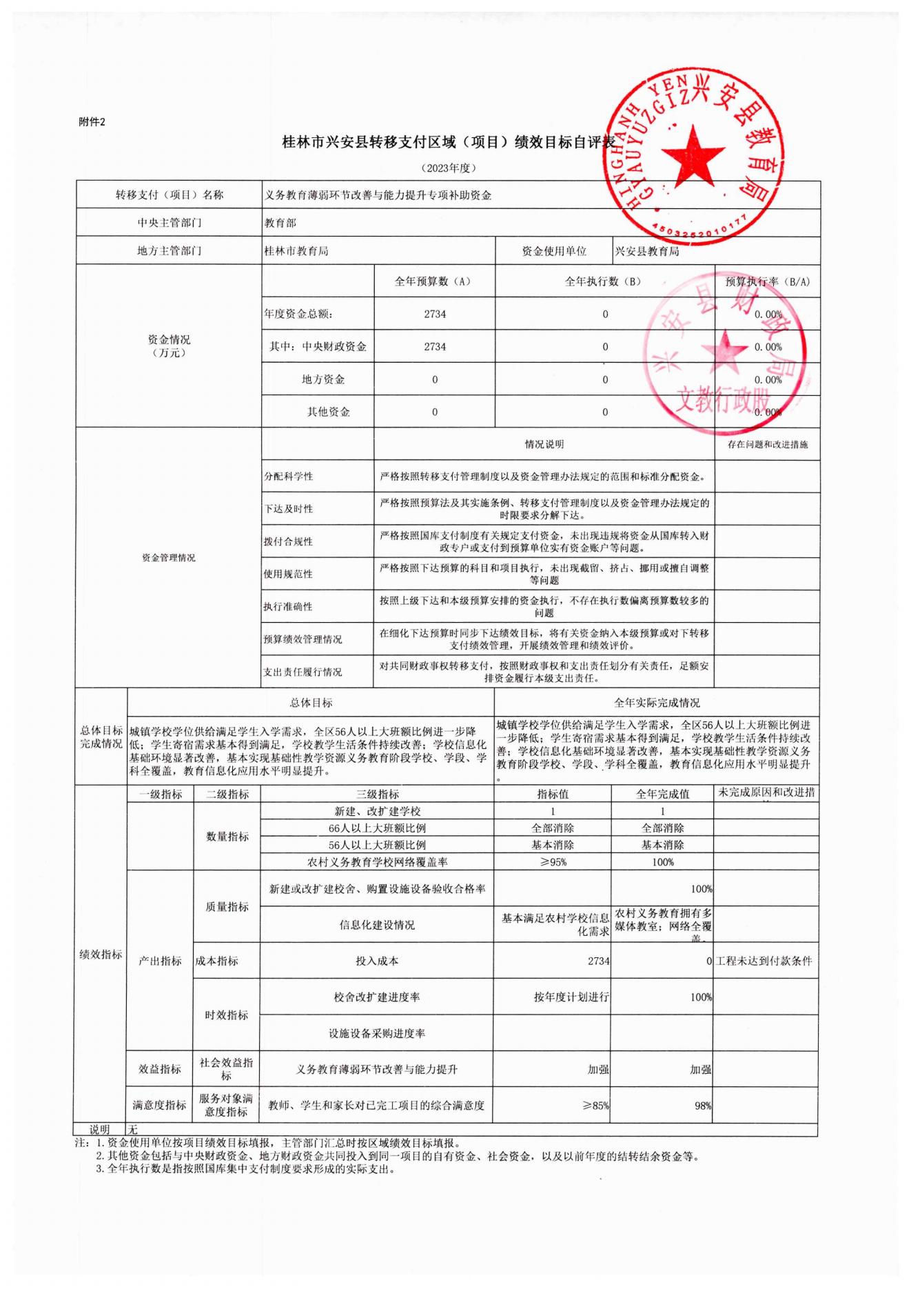 桂林市兴安县2023年度义务教育薄弱环节改善与能力提升专项补助资金转移支付区域(项目)绩效目标自评表