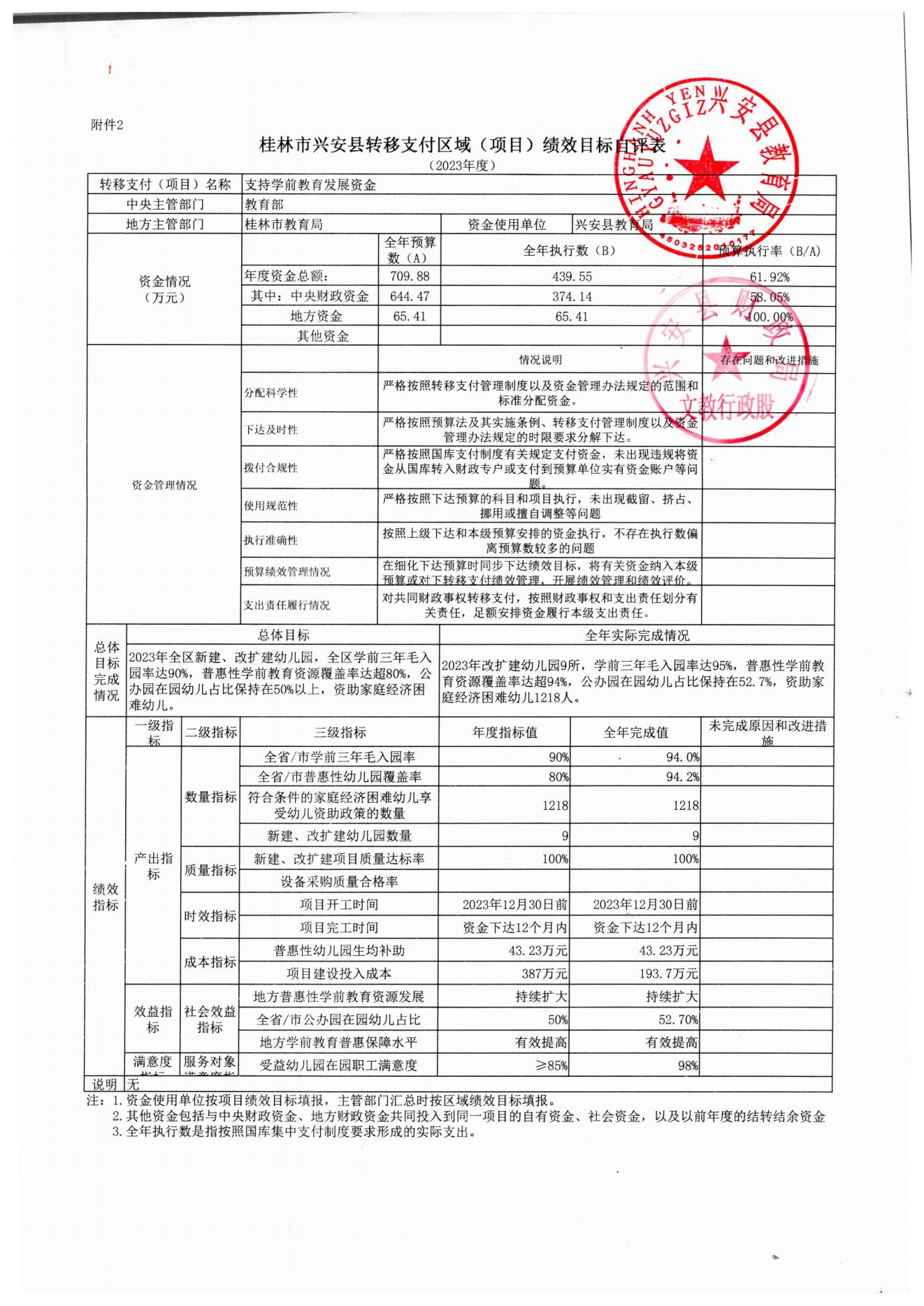桂林市兴安县2023年度支持学前教育发展资金转移支付区域(项目)绩效目标自评表