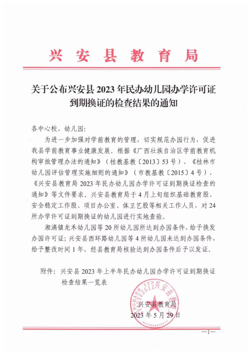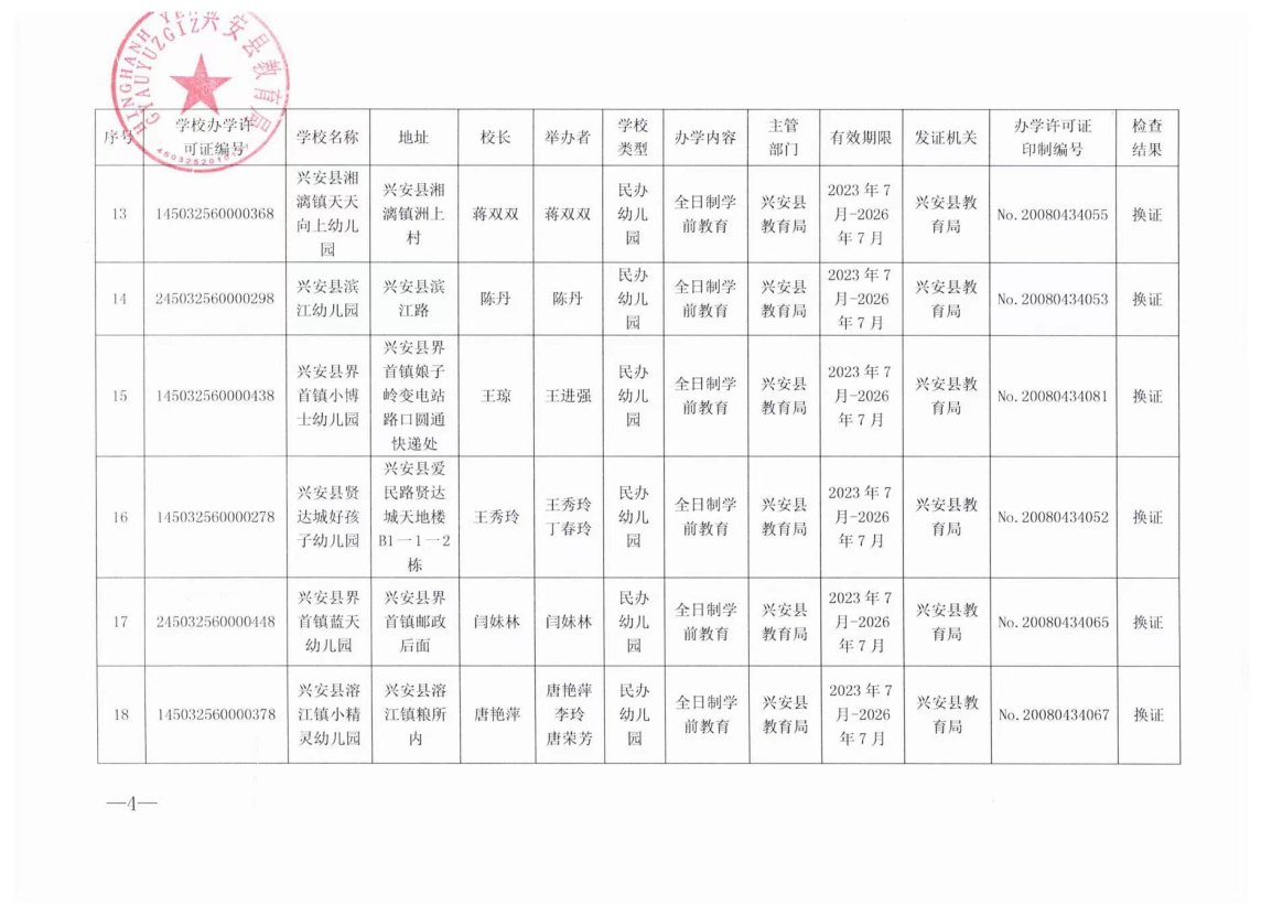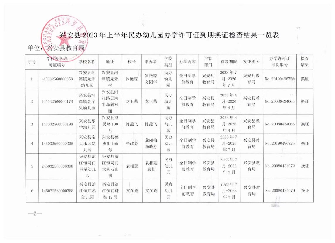 关于公布兴安县2023年民办幼儿园办学许可证到期换证的检查结果的通知
