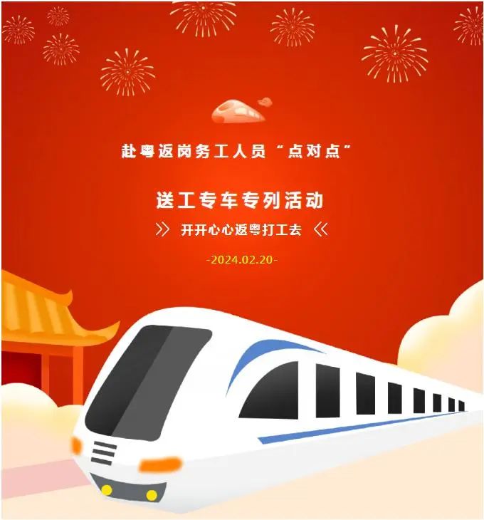 按照《广西壮族自治区外出务工人员工作领导小组办公室关于进一步加强脱贫人口等重点群体“点对点”送工服务的通知》要求,为进一步深化结对帮扶关系,充分发挥粤桂劳务协作机制作用,开展支持企业用工专项行动,满足企业用工需求,实现“从家门到车门,从车门到厂门”的送工绿色直通车,桂林市人力资源和社会保障局定于2024年2月20日(农历正月十一)在桂林火车北站组织开展赴粤返岗务工人员“点对点”送工专车专列活动,现将有关事项通知如下。