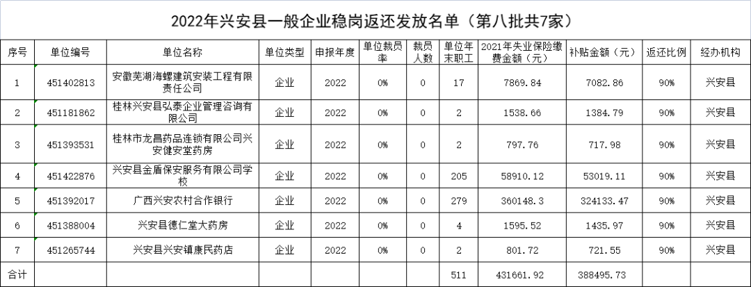 兴安县社会保险事业管理中心一般企业稳岗返还(2022年第八批)审核通过企业名单公示