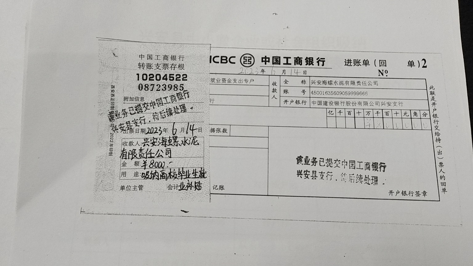 兴安县海螺水泥有限责任公司吸纳高校毕业生就业补贴结果