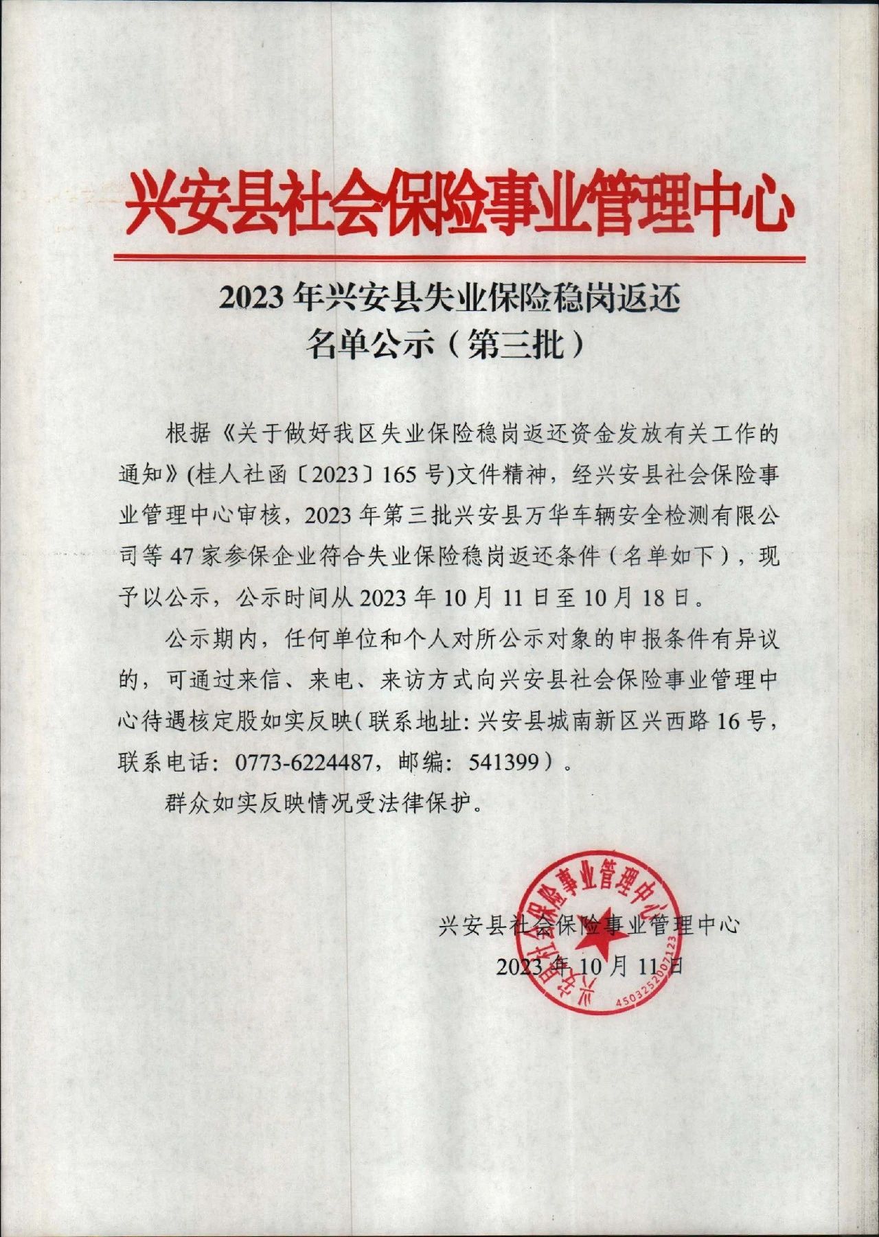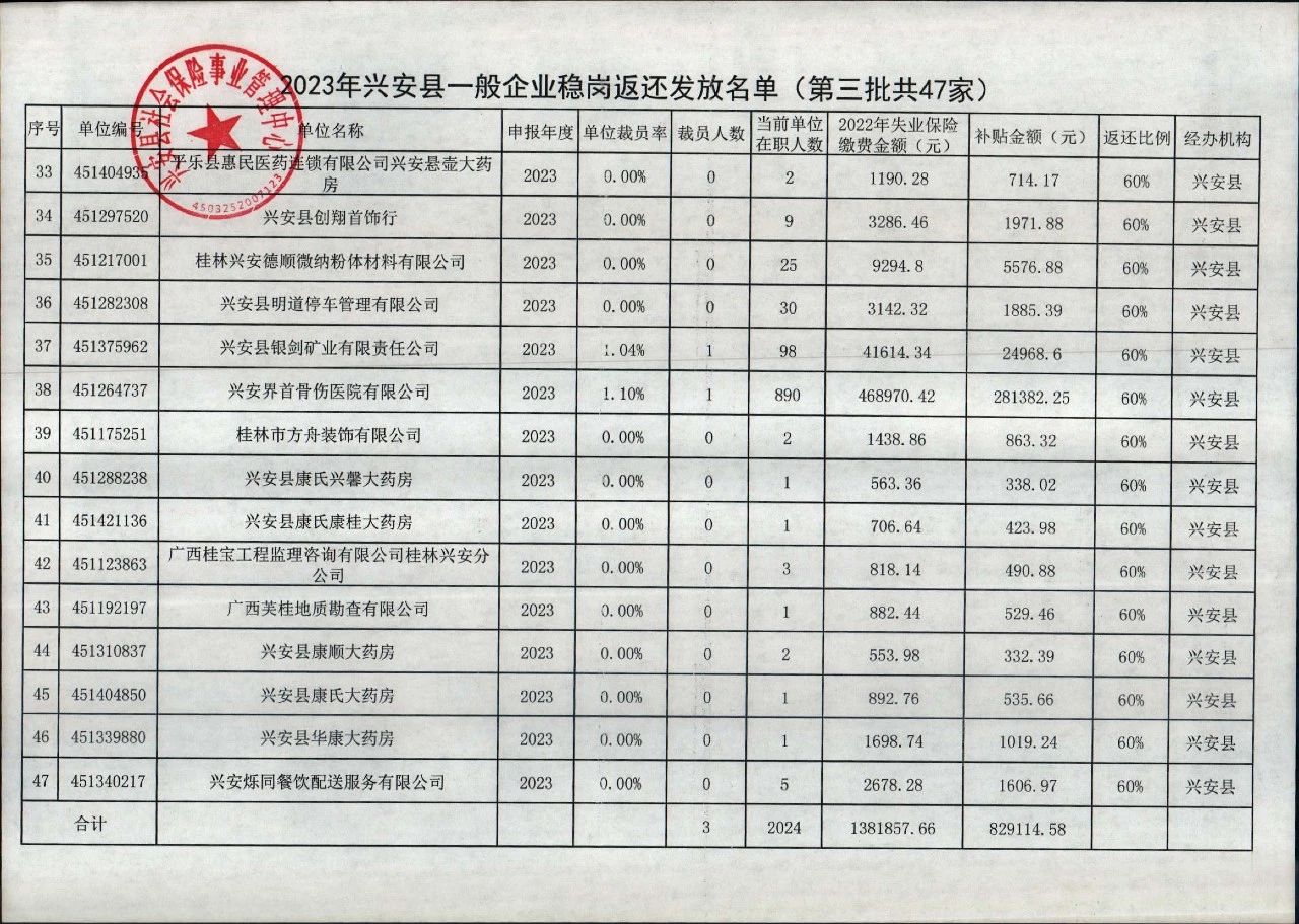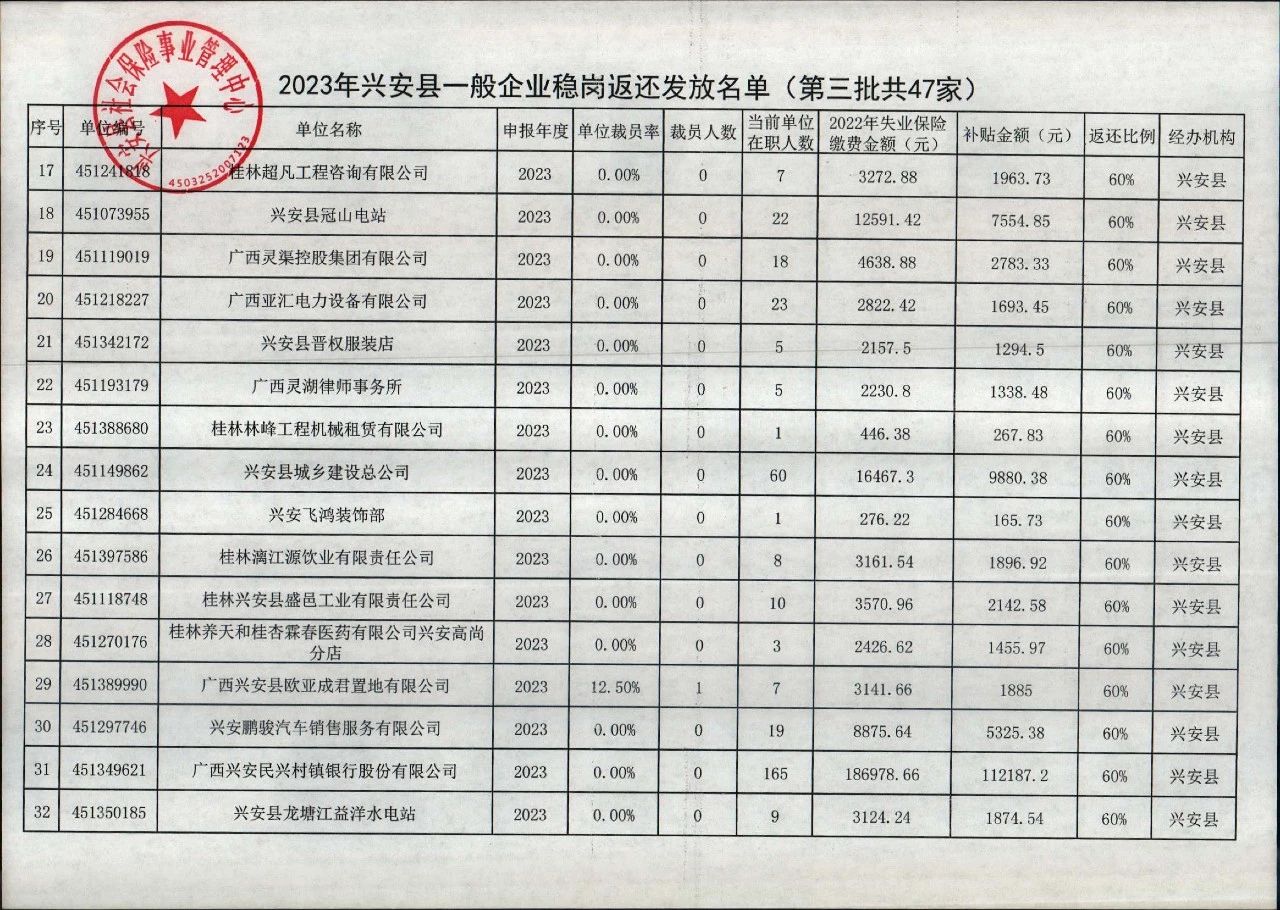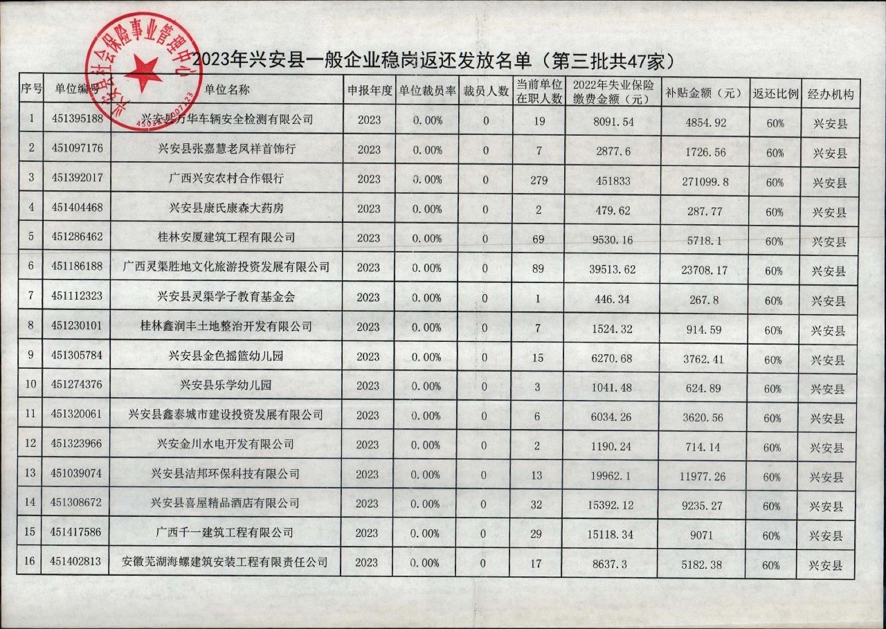 2023年兴安县失业保险稳岗返还名单公示( 第三批 )
