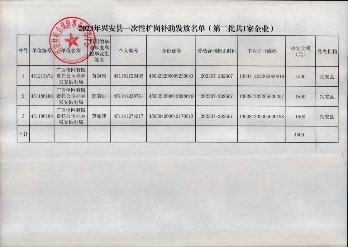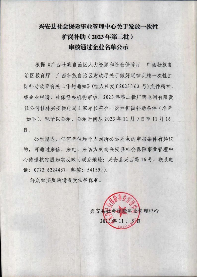 兴安县社会保险事业管理中心关于发放一次性扩岗补助(兴安县2023年第二批)审核通过企业名单公示