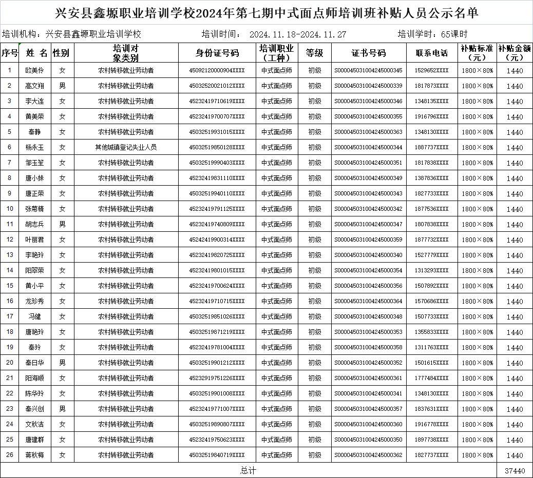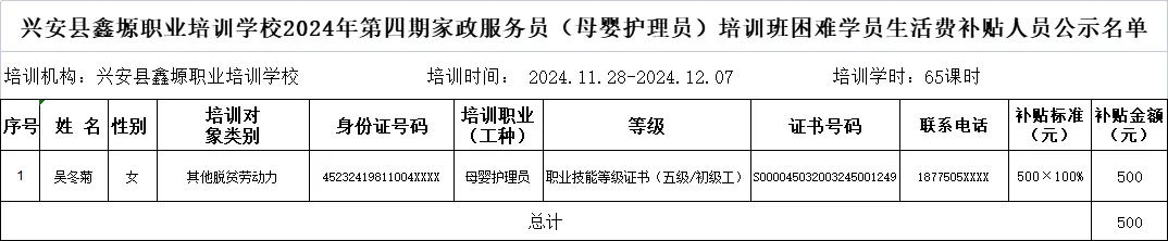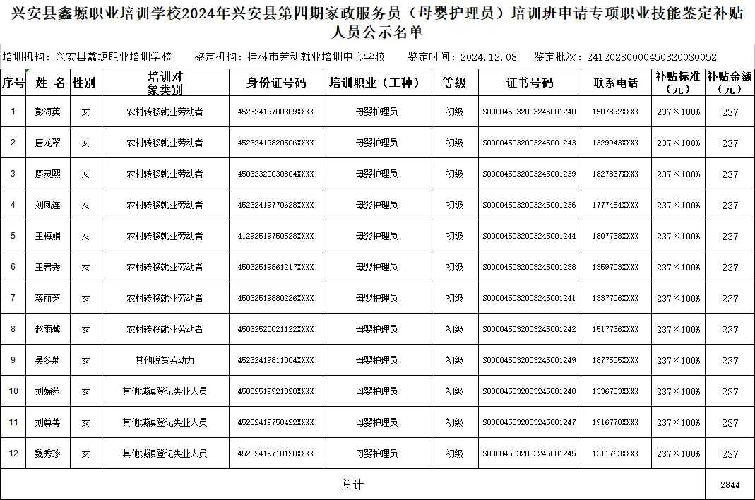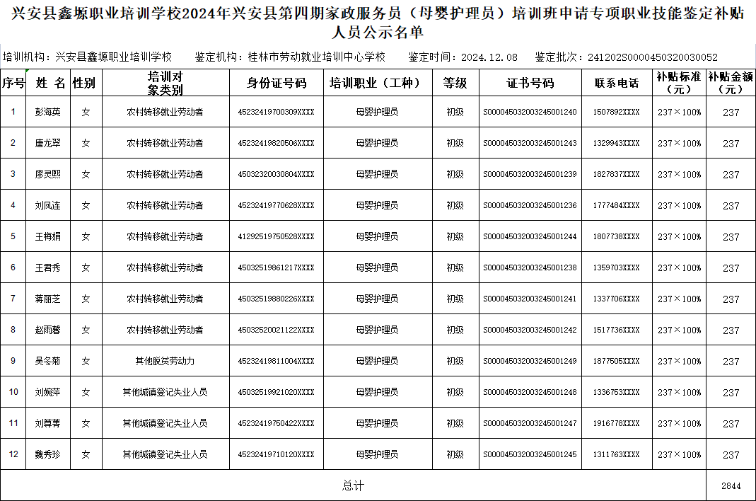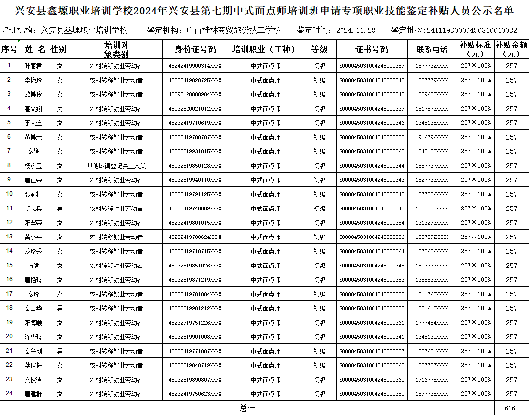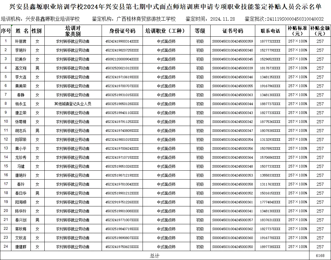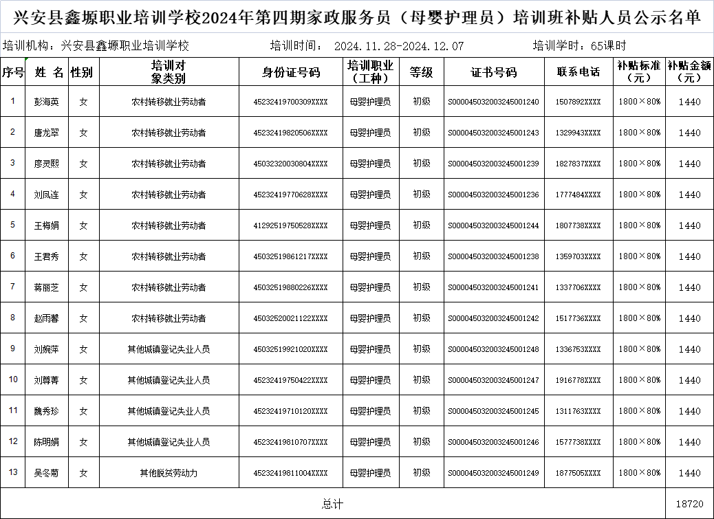 附件:兴安县鑫塬职业培训学校申领2024年第七期中式面点师培训班、2024年第四期家政服务员(母婴护理员)培训班培训补贴、鉴定补贴、生活费补贴人员名单