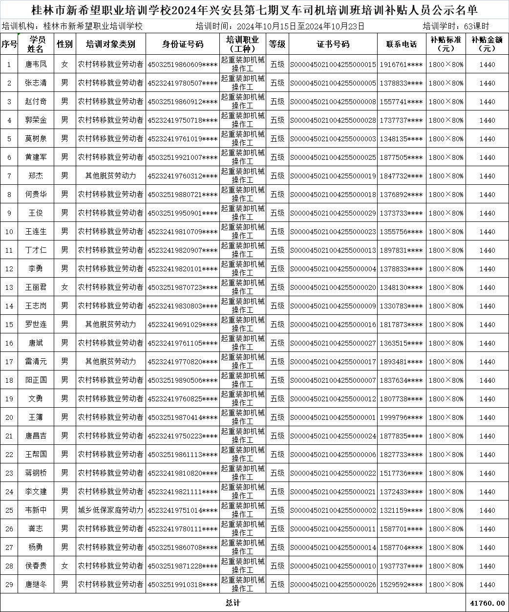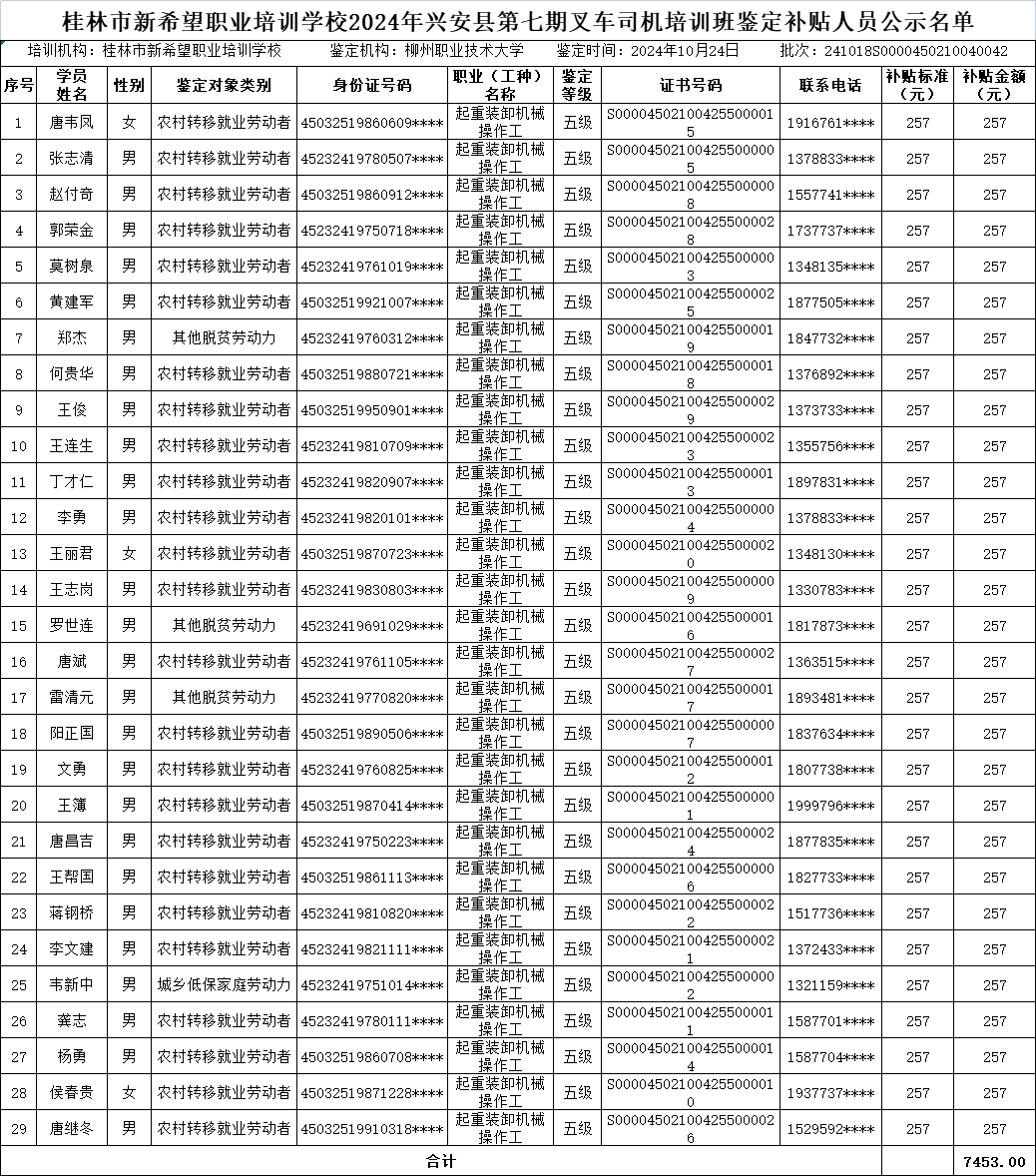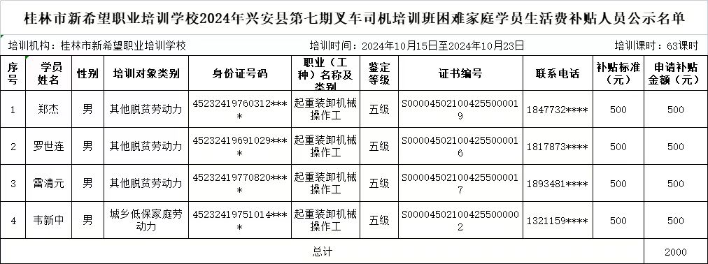 附件:桂林市新希望职业培训学校申领2024年第七期叉车司机培训班职业技能培训补贴、职业技能鉴定补贴、职业技能培训生活费补贴人员名单