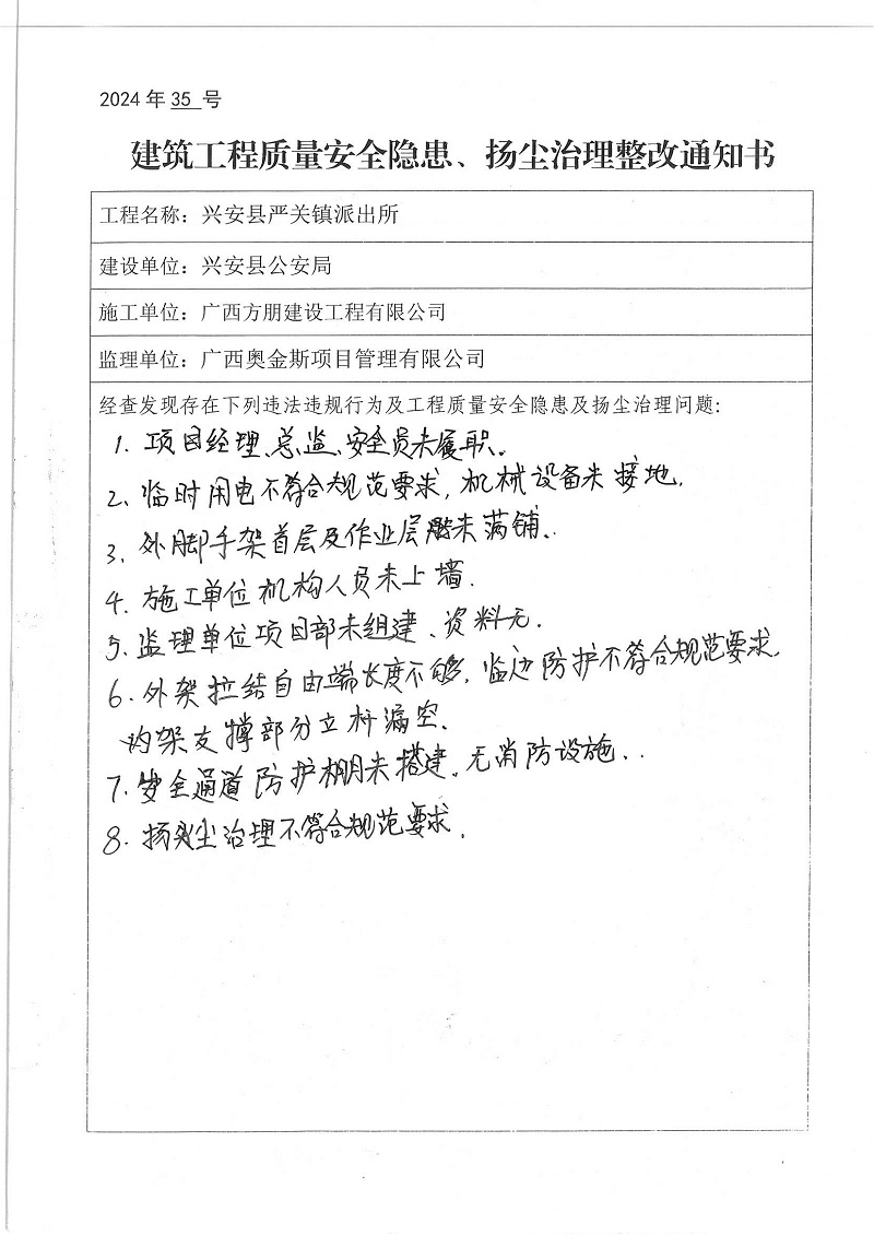 建筑工程质量安全隐患、扬尘治理整改通知书