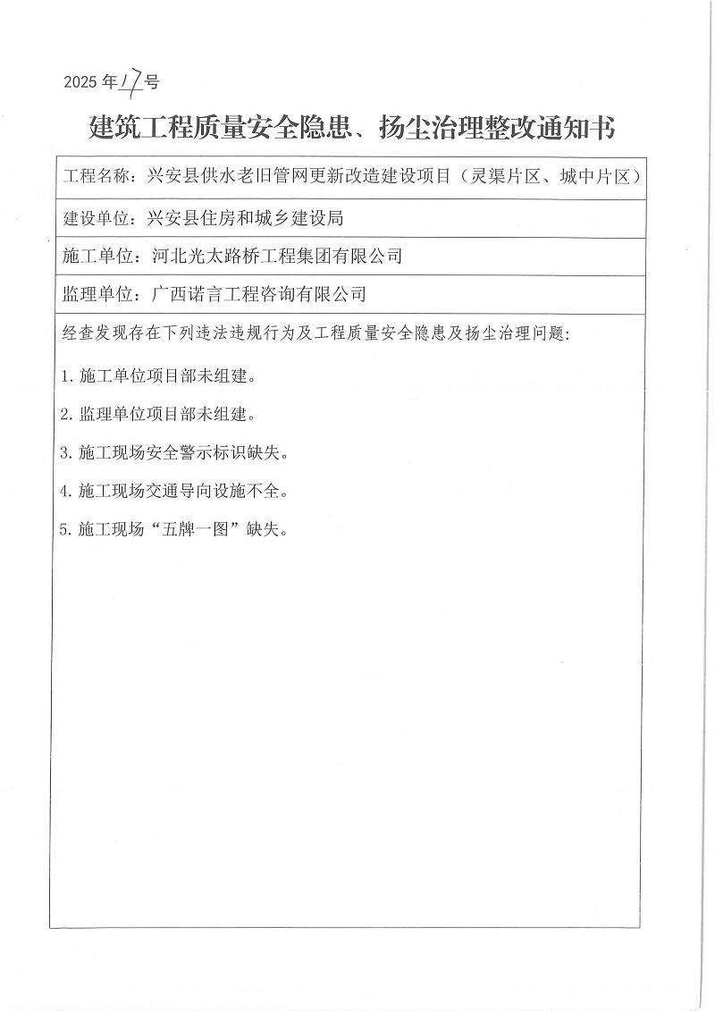 建筑工程质量安全隐患、扬尘治理整改通知书