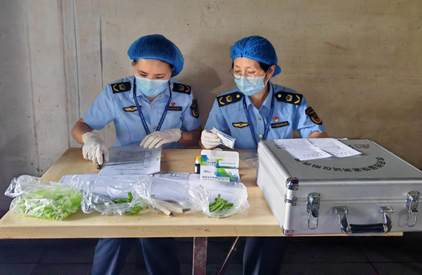 图为执法人员在辖区中考考点食堂对食品原料开展现场快速筛查