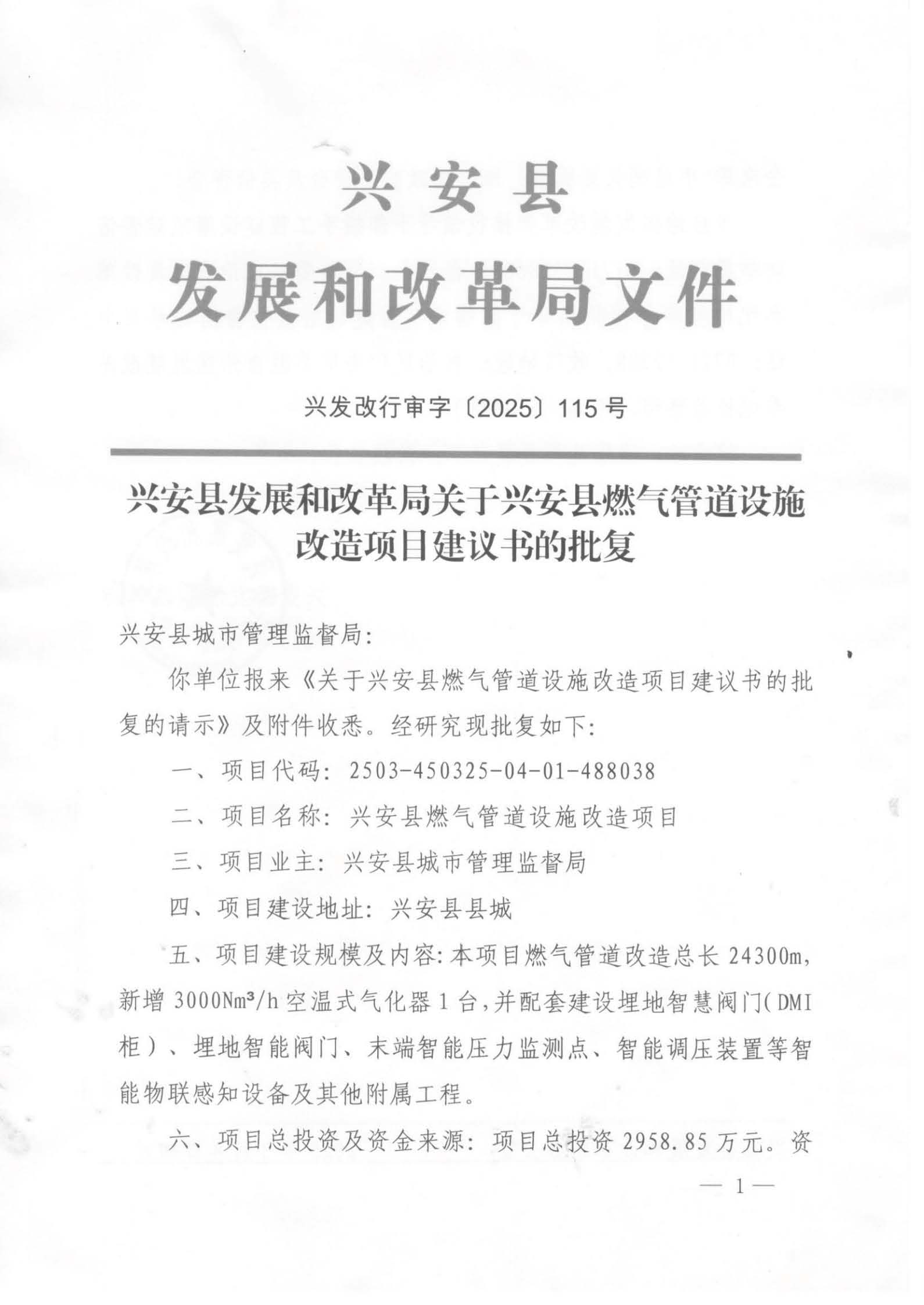 兴安县发展和改革局关于兴安县燃气管道设施改造项目建议书的批复