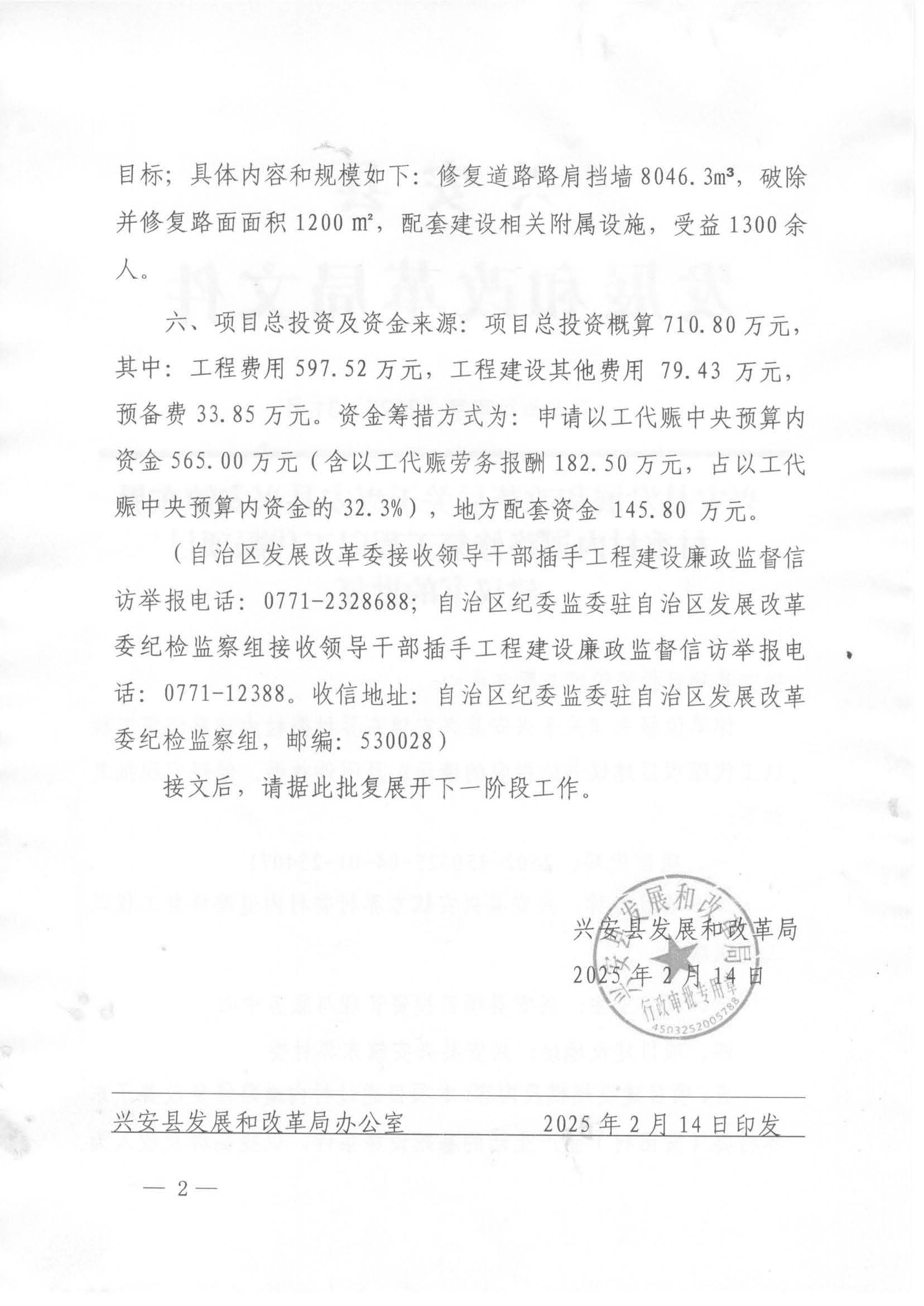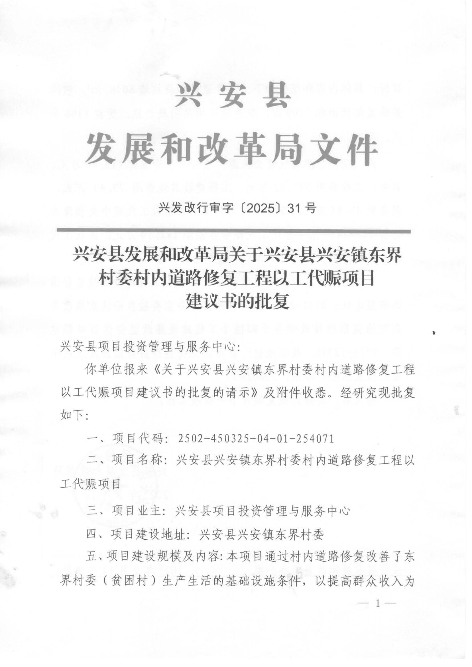 兴发改行审字〔2025〕31号 兴安县发展和改革局关于兴安县兴安镇东界村委村内道路修复工程以工代赈项目建议书的批复