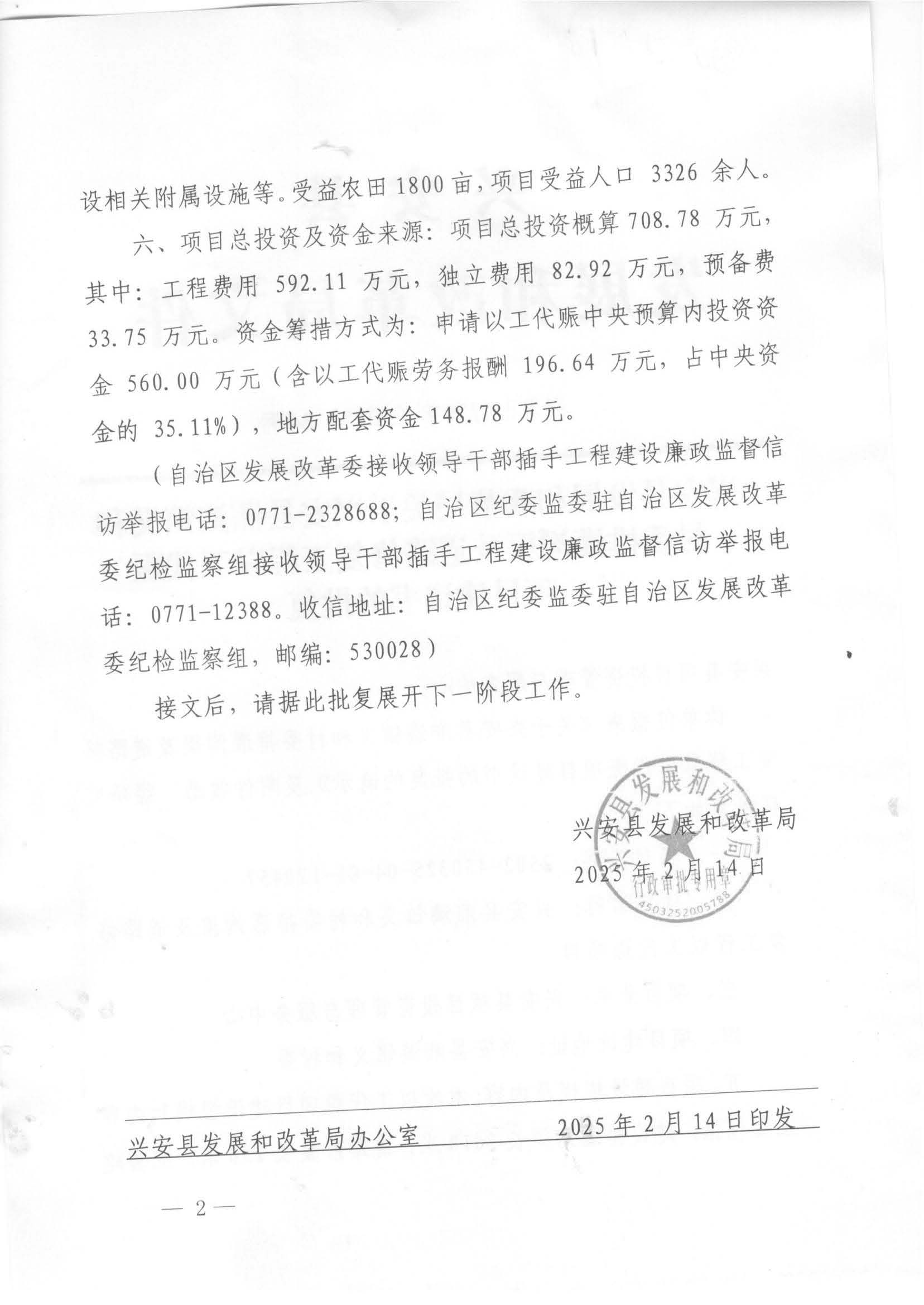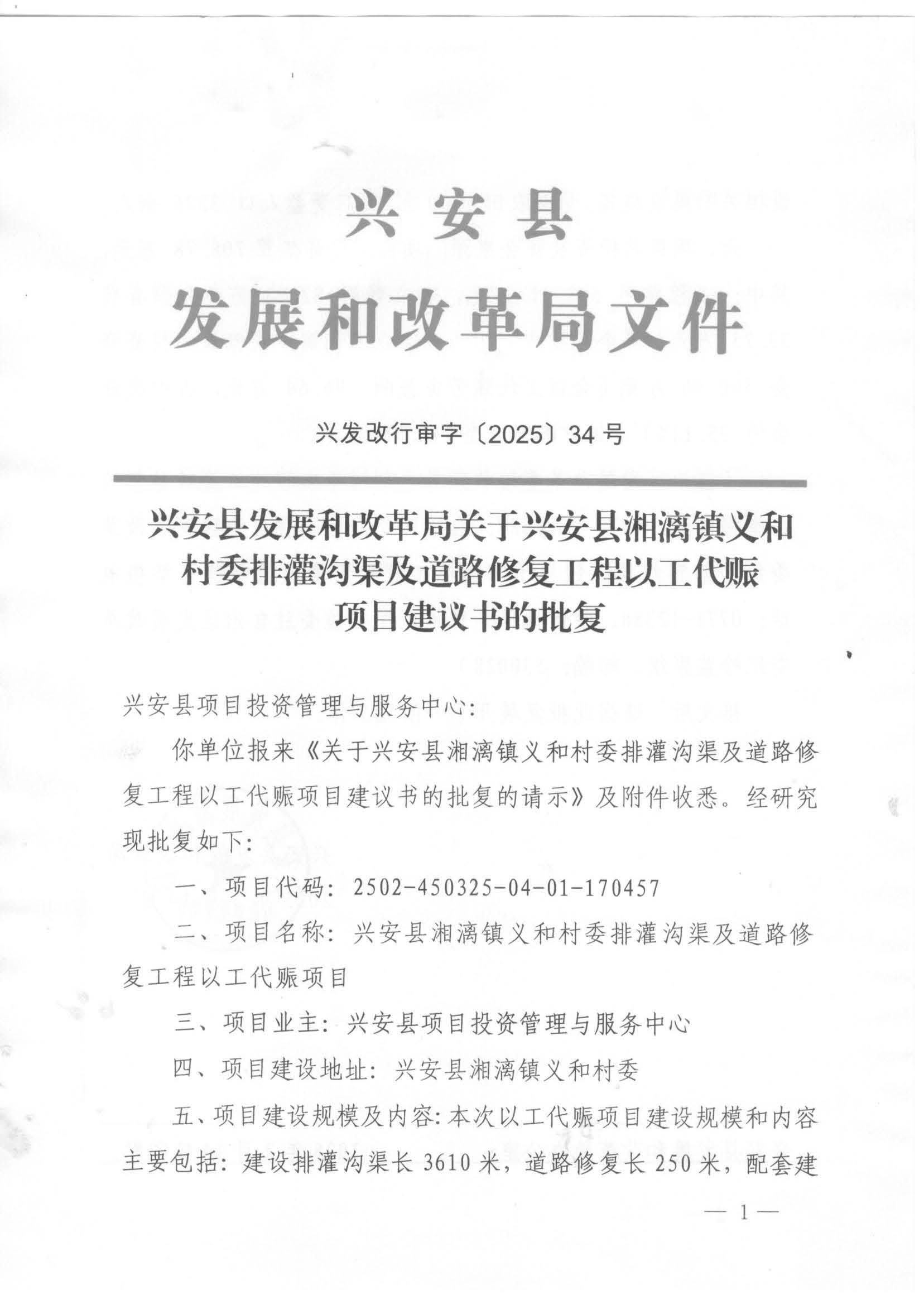 兴发改行审字〔2025〕34号 兴安县发展和改革局关于兴安县湘漓镇义和村委排灌沟渠及道路修复工程以工代赈项目建议书的批复