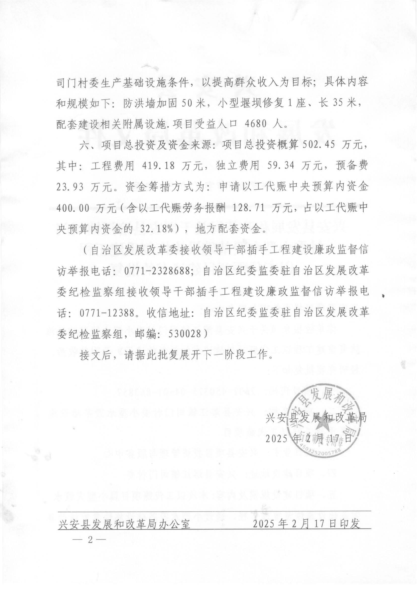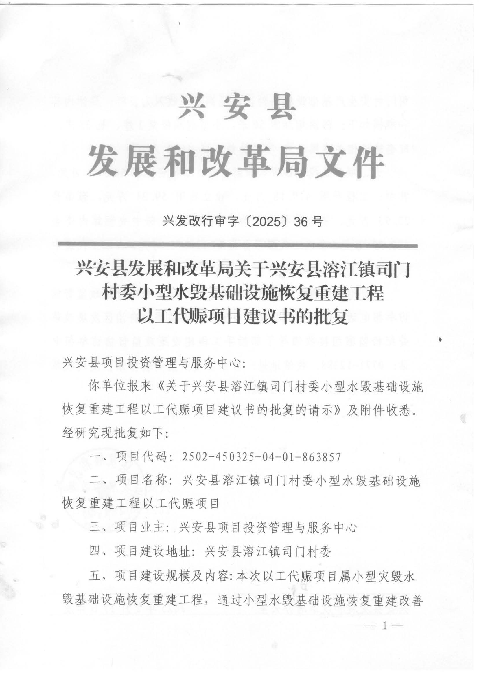兴发改行审字〔2025〕36号 兴安县发展和改革局关于兴安县溶江镇司门村委小型水毁基础设施恢复重建工程以工代赈项目建议书的批复