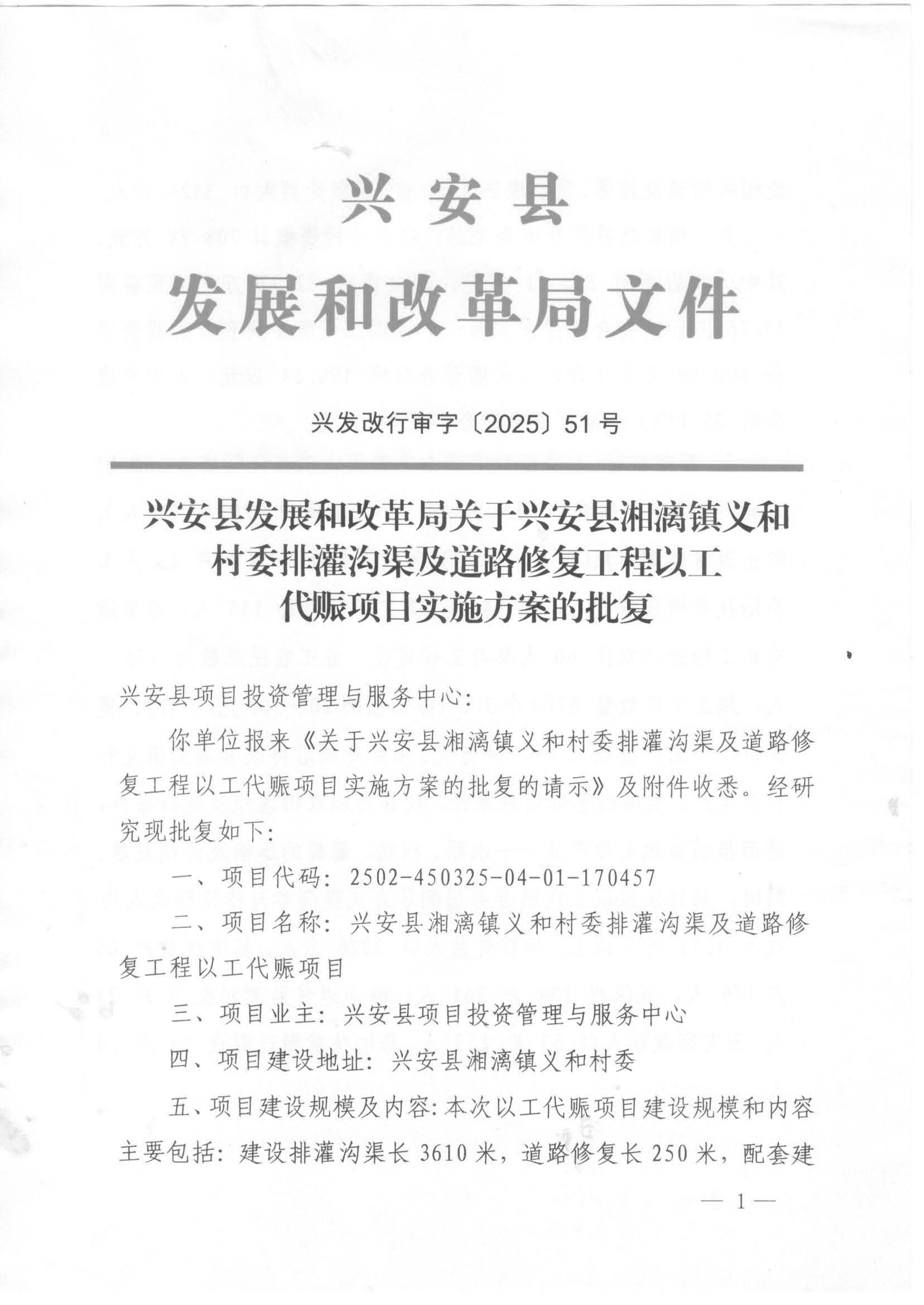 兴发改行审字〔2025〕51号 兴安县发展和改革局关于兴安县湘漓镇义和村委排灌沟渠及道路修复工程以工代赈项目实施方案的批复