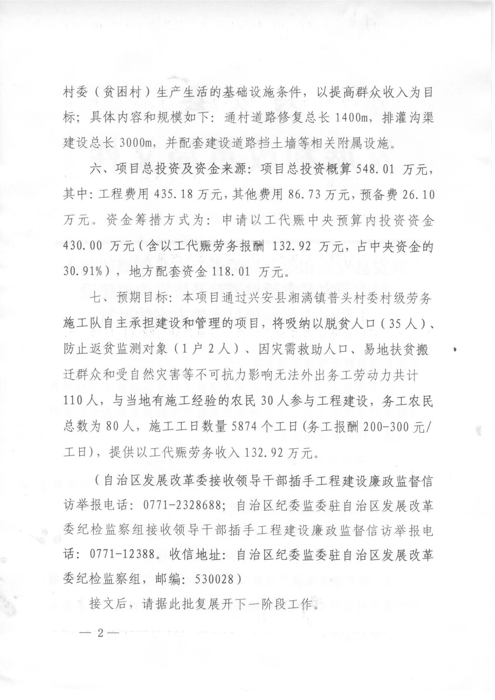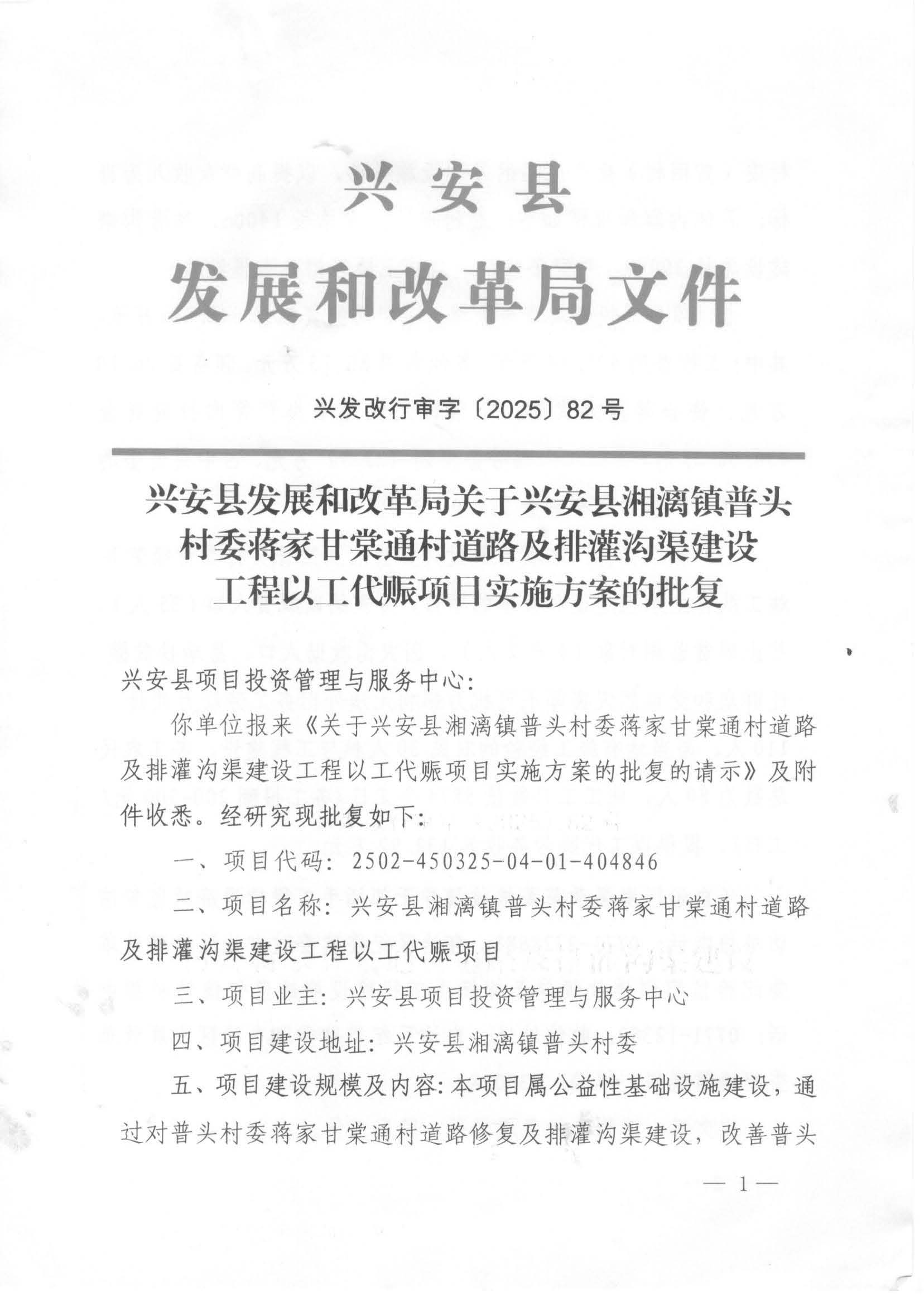 兴发改行审字〔2025〕82号兴安县发展和改革局关于兴安县湘漓镇普头村委蒋家甘棠通村道路及排灌沟渠建设工程以工代赈项目实施方案的批复