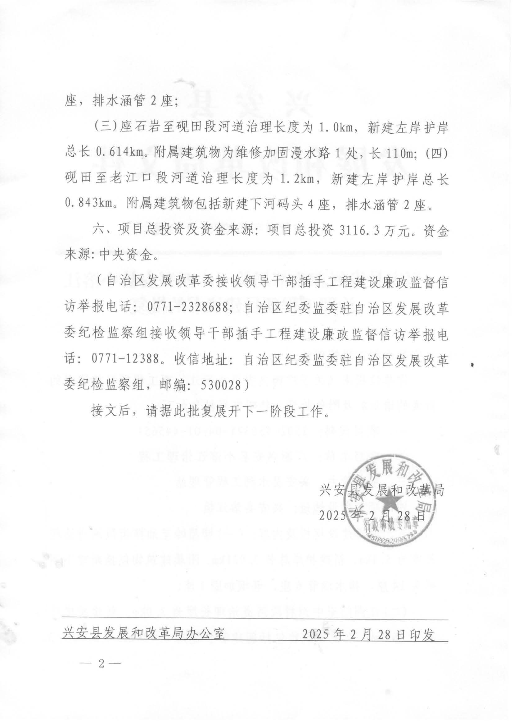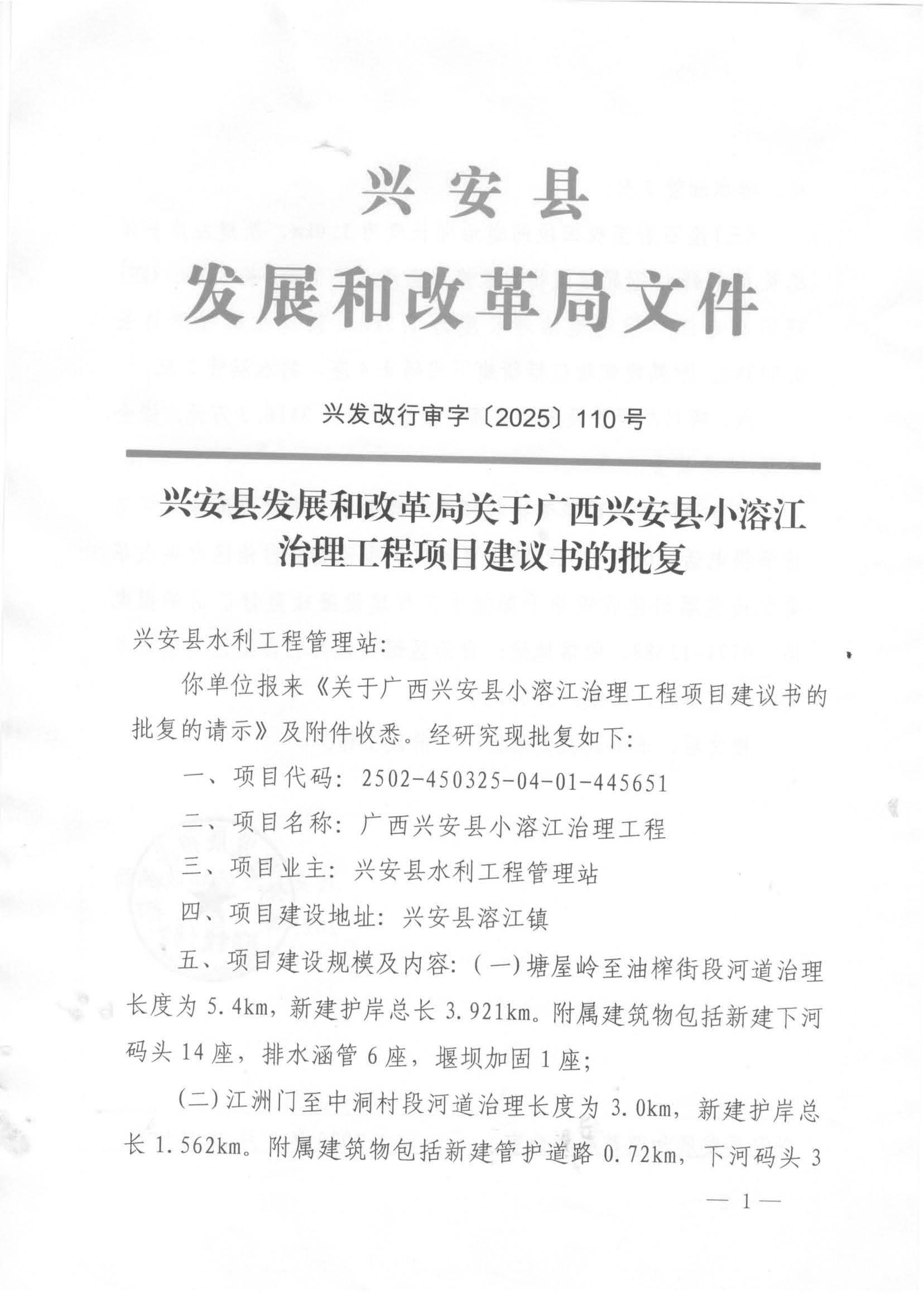 兴发改行审字〔2025〕110号 兴安县发展和改革局关于广西兴安县小溶江治理工程项目建议书的批复