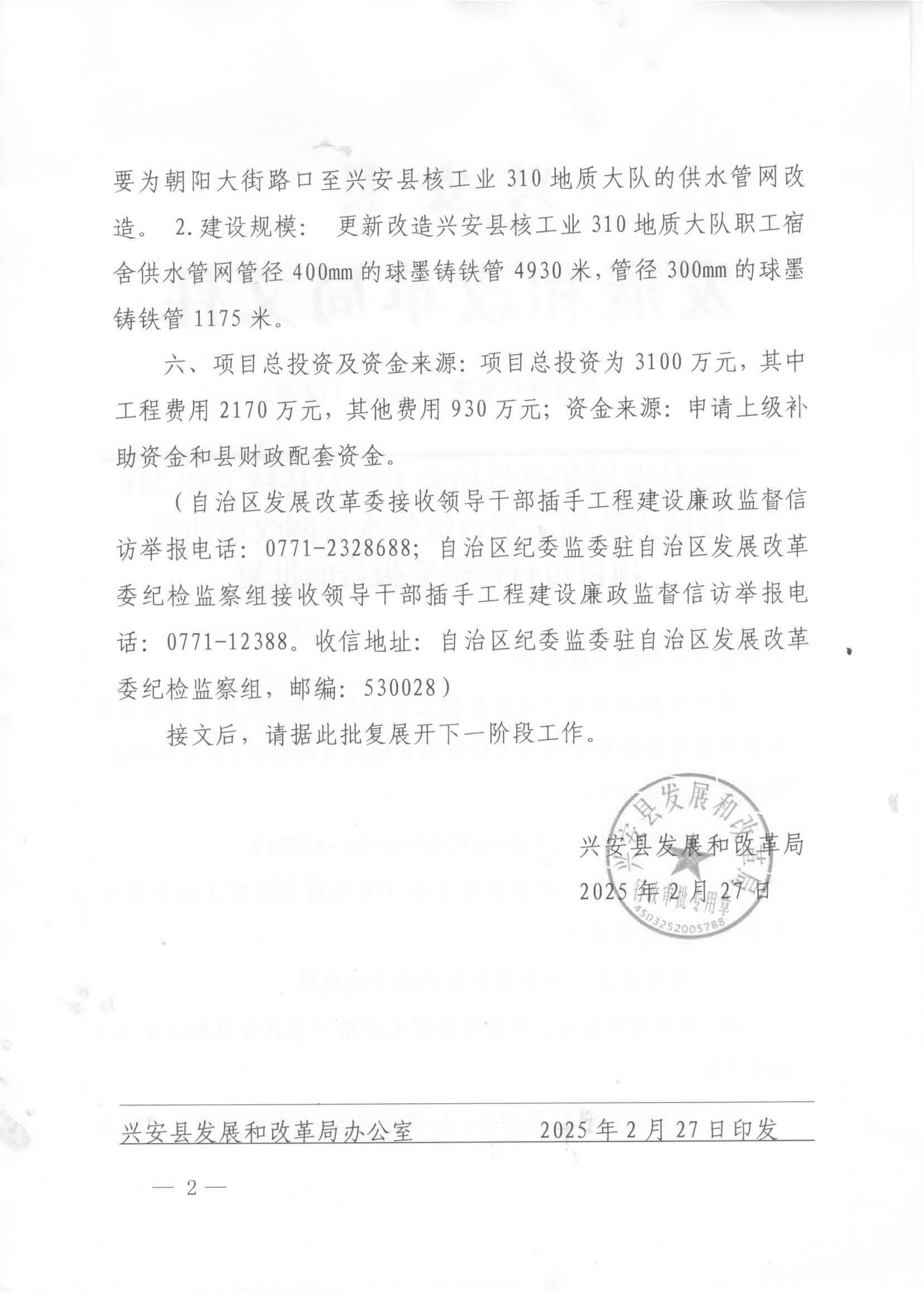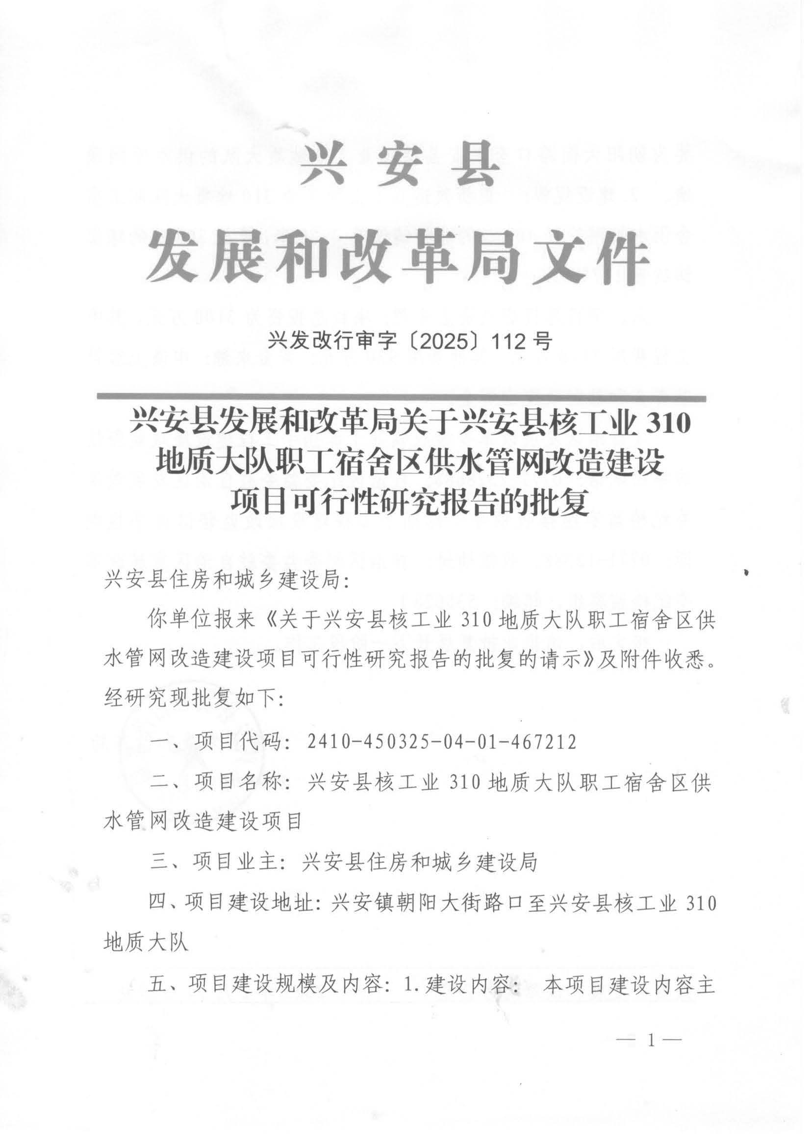 兴发改行审字〔2025〕112号 兴安县发展和改革局关于兴安县核工业310地质大队职工宿舍区供水管网改造建设项目可行性研究报告的批复