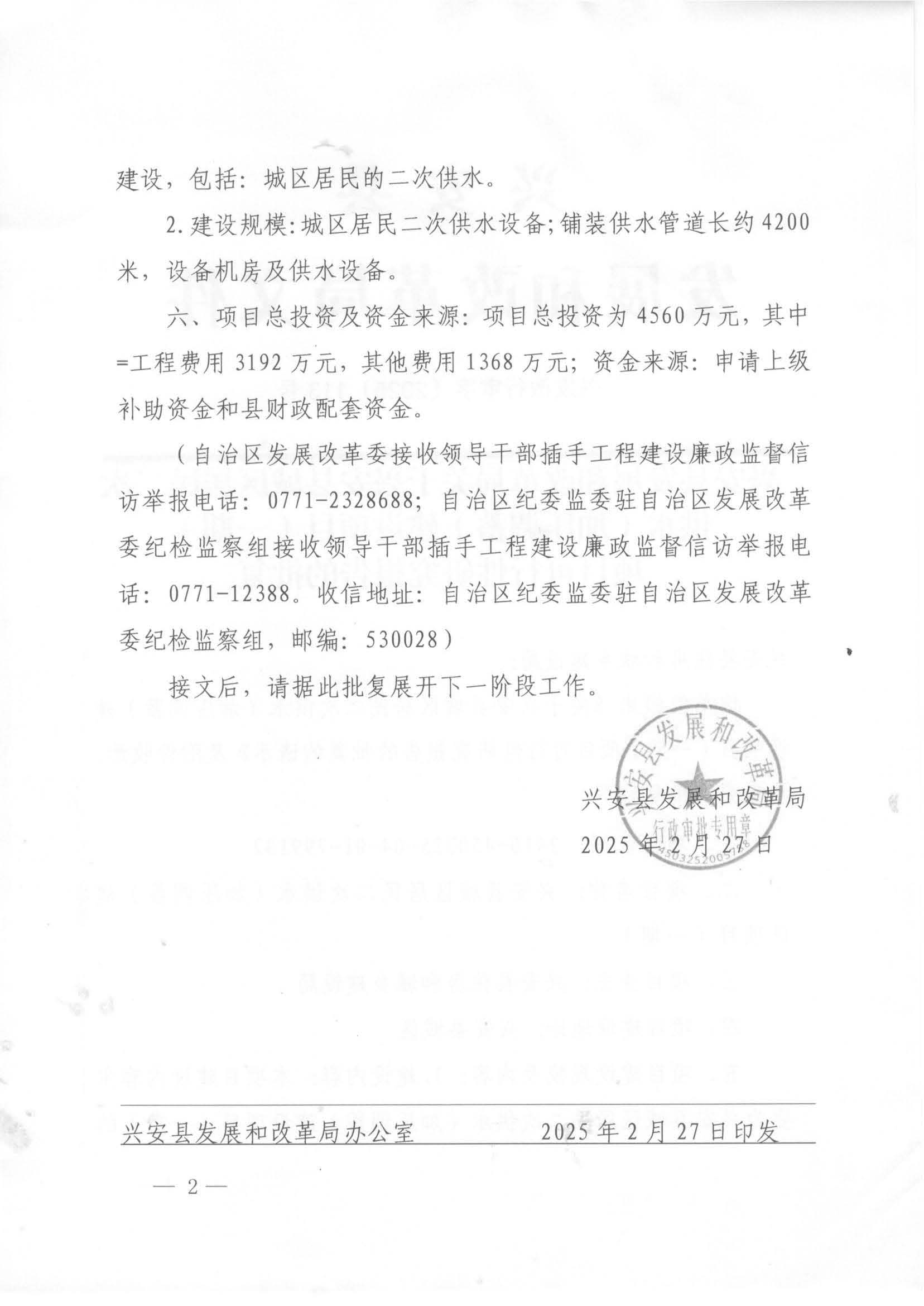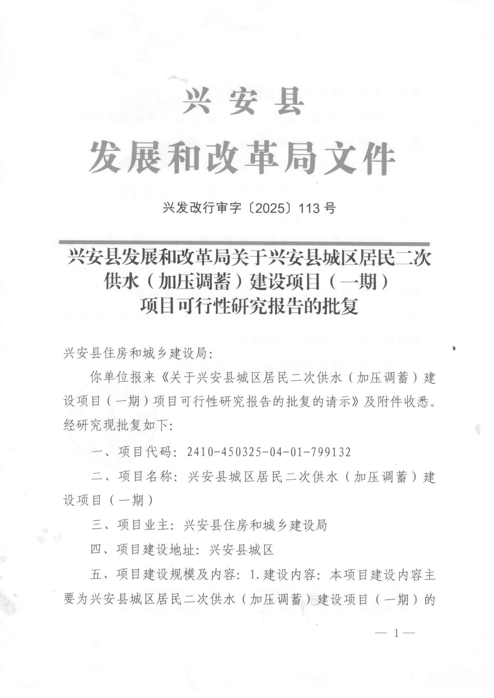 兴发改行审字〔2025〕113号 兴安县发展和改革局关于兴安县城区居民二次供水(加压调蓄)建设项目(一期)项目可行性研究报告的批复