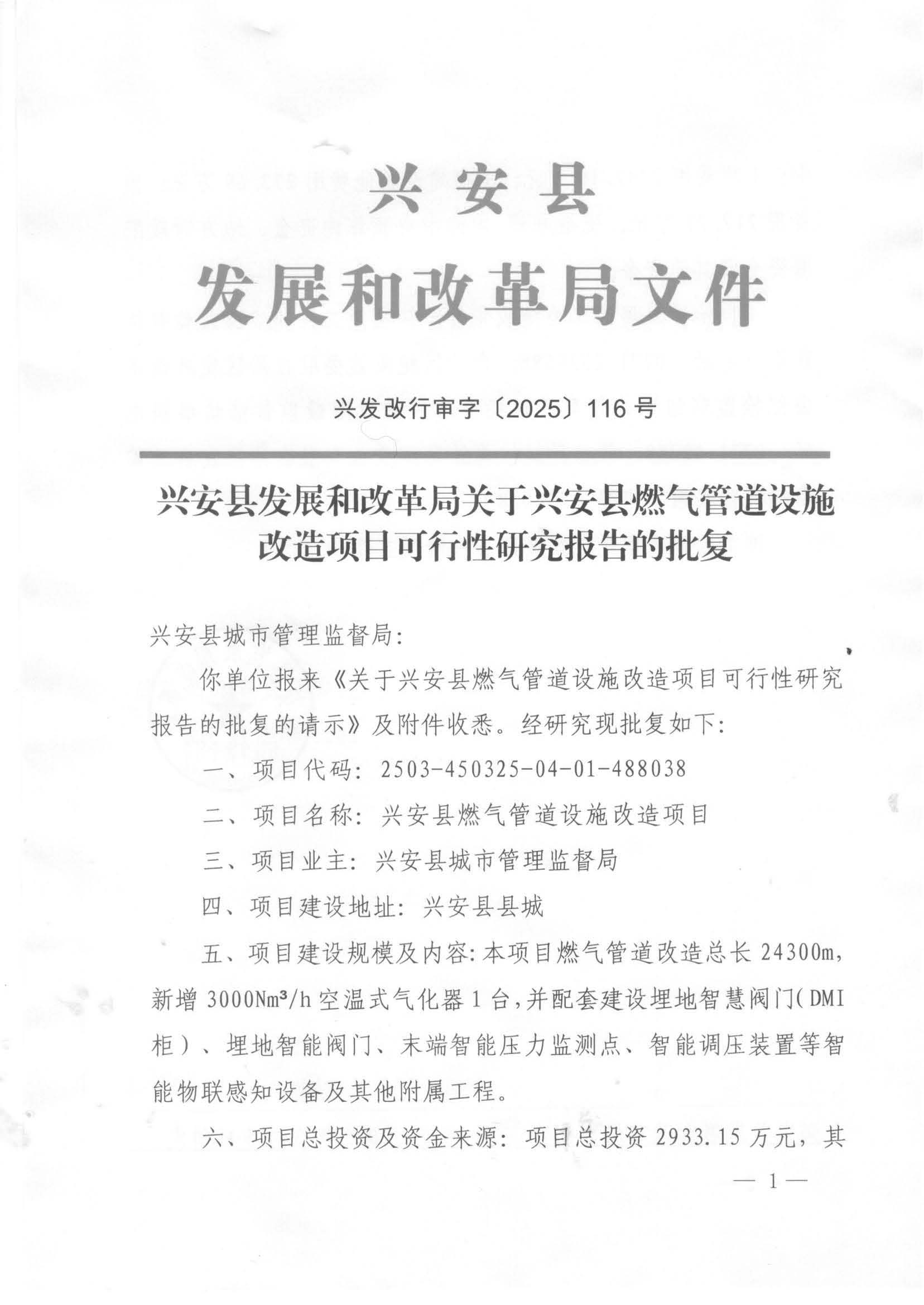 兴发改行审字〔2025〕116号 兴安县发展和改革局关于兴安县燃气管道设施改造项目可行性研究报告的批复