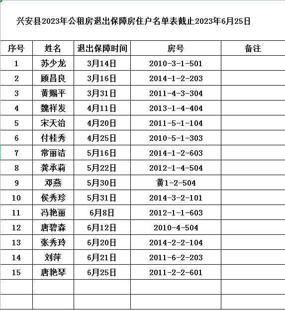 兴安县2023年公租房退出保障房住房户名单表截至2023年6月25日