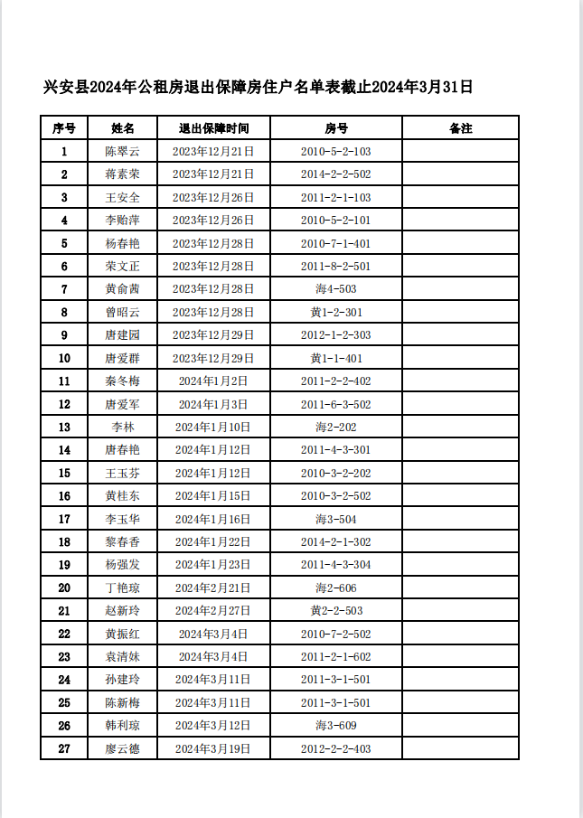 兴安县2024年公租房退出保障住户名单表截至2024年3月31日