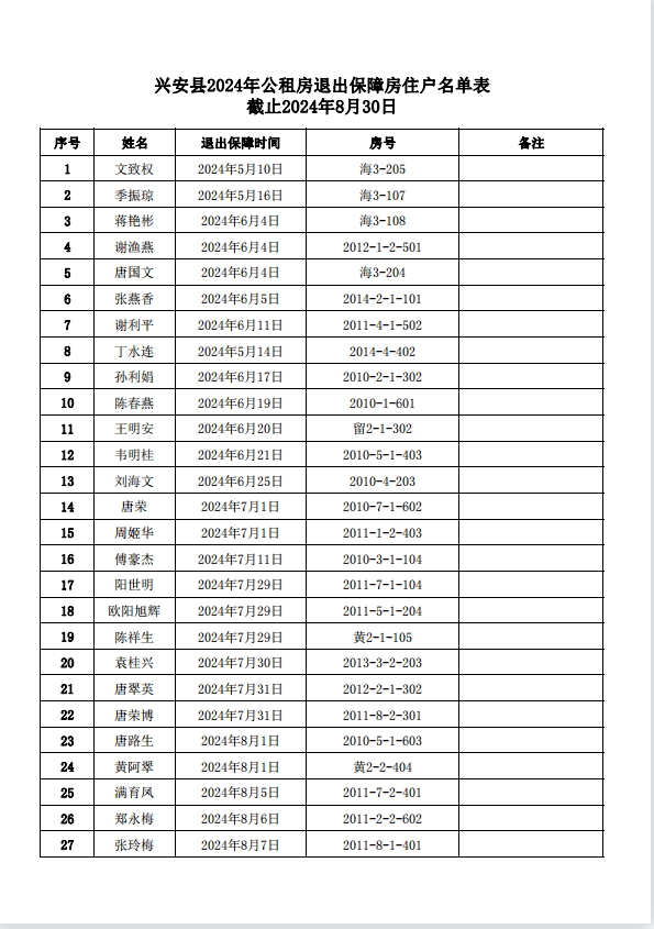 兴安县2024年公租房退出保障房住户名单表 截至2024年8月30日