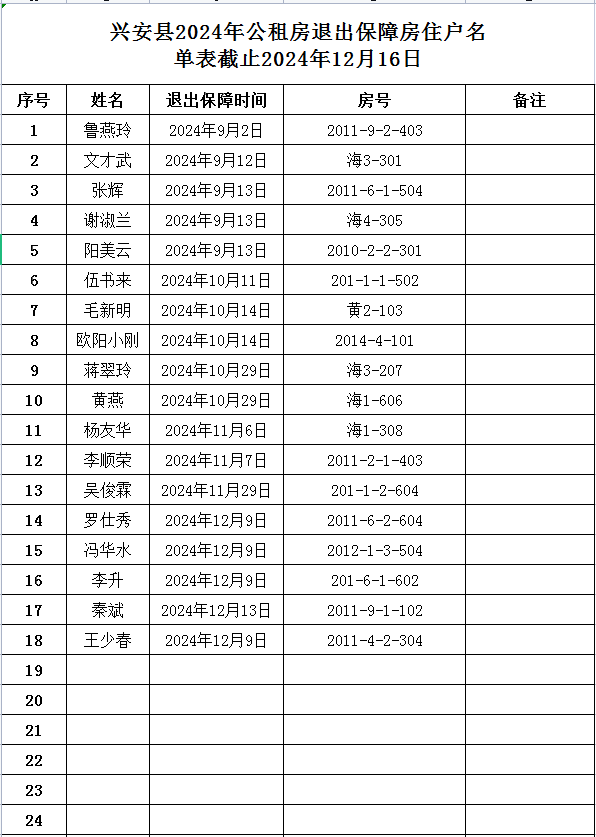 兴安县2024年公租房退出保障房住户名单表 截至2024年12月16日