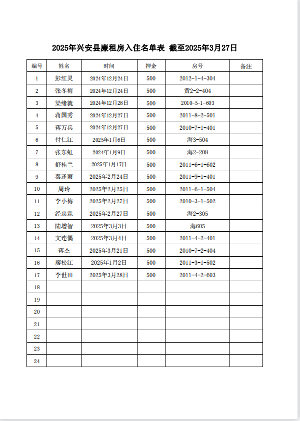 2025年兴安县廉租房入住名单表截至2025年3月27日