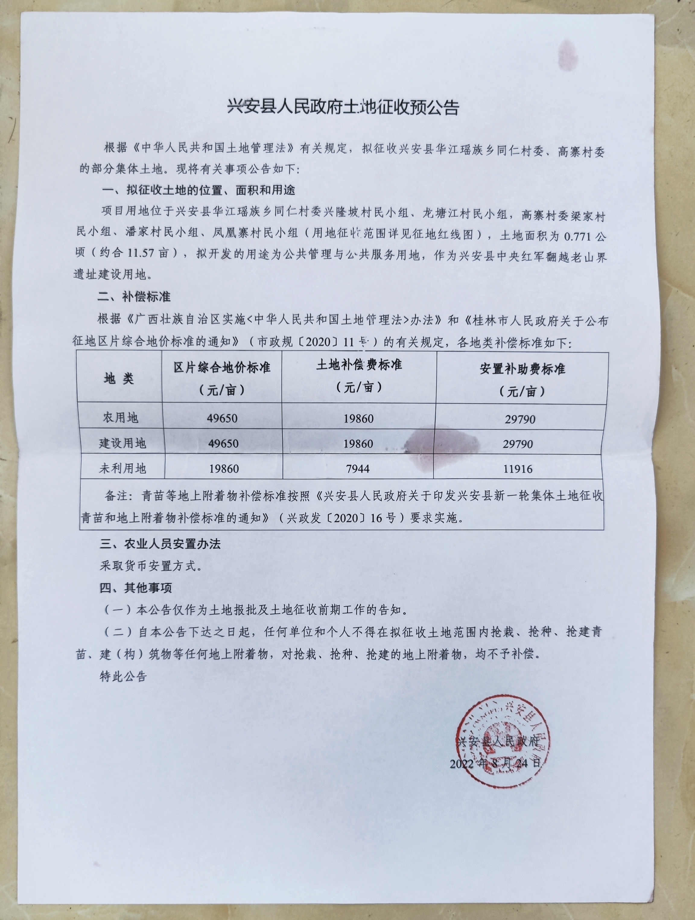 兴安县中央红军翻越老山界遗址建设用地土地征收预公告